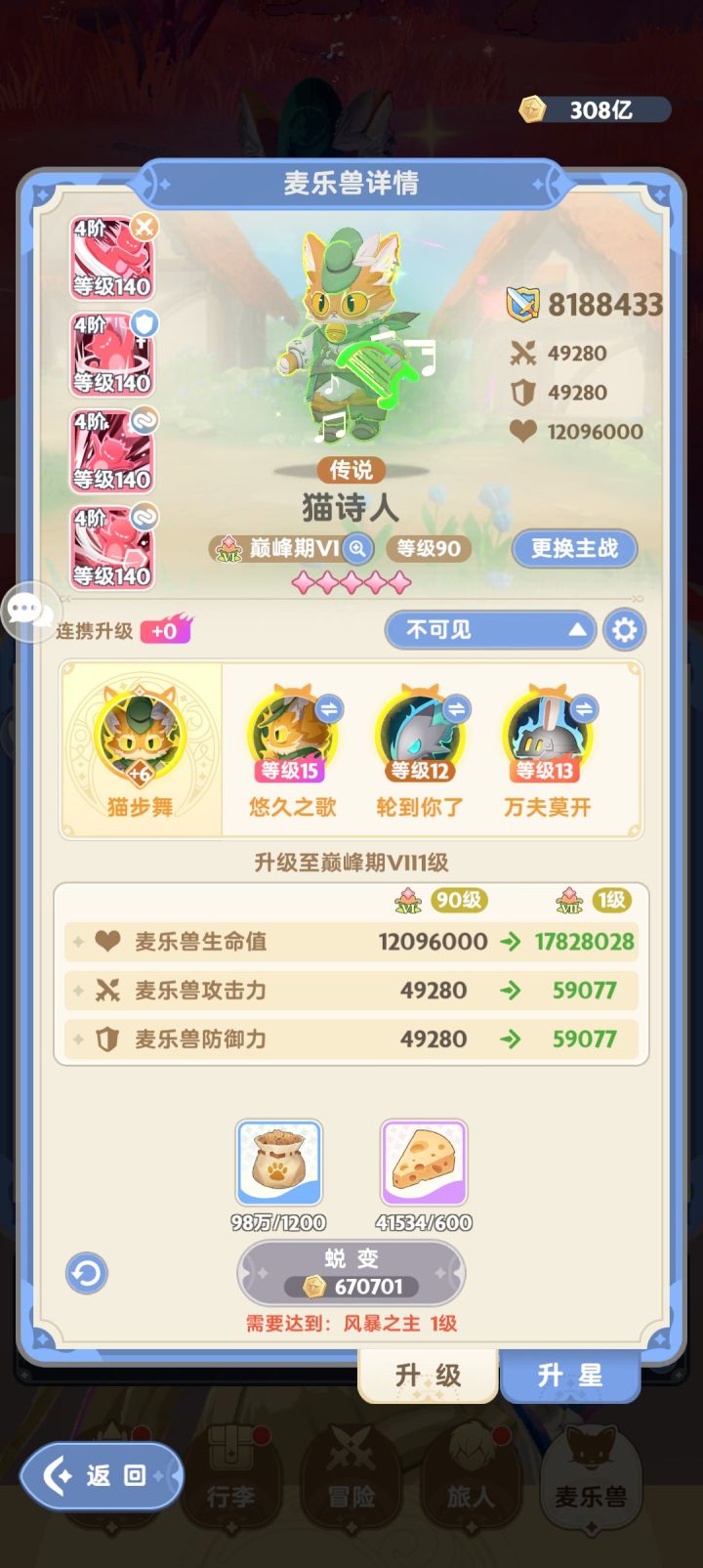 对比第315天技能升2星星途升2星宠物特技升1级神话坐骑升1星攻击539.2→576.7战术伤害44.3%→46.6%核心伤害56.6%→60.6%被动伤害62.4%→66.4%