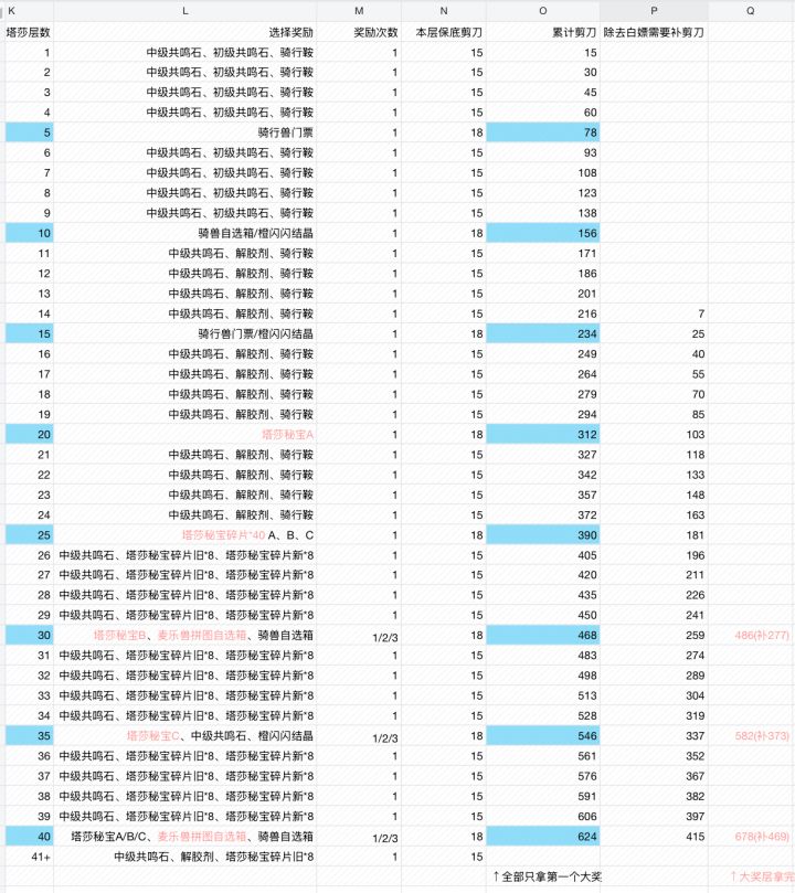 新增图一(2025年五一版本的塔莎)文档导出图片还要收VIP钱,所以清晰度和水印有问题有错误可及时反馈!—————————⬇️这些是图二内容(常规塔莎)O列表示大奖层第一个大奖就出需要的幸运儿的保底,Q列表示30、35、40层第三个大奖才出想要的倒霉蛋的终极大保底。已知小层保底15次,大奖保底18次,每层36个坑位。L列奖励的选择仅代表个人见解,你想选别的也可以。策
