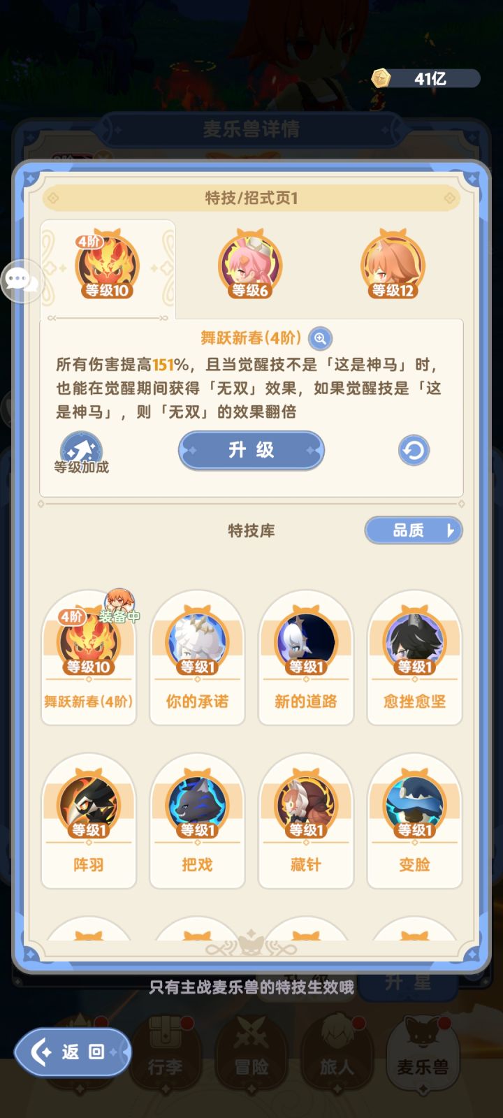 抽取消耗:奖池抽取概率为3% 33抽左右一只70片碎片可以升10级特技加上本体就是要抽15只保底15*33*150=74250钻 左右 建议快抽够时换单抽 不要10连多抽浪费觉醒和特技的增伤随着代数提升,无双效果不变特技增伤大致对比各代特技增伤觉醒期间 获得无双(仅装备 特技/主宠神马 即可触发)敌人血量>50%:技巧+8% 暴击+8%敌人血量<50%:伤害提高16%(
