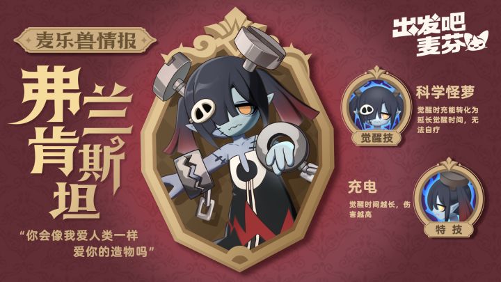 是造物,也是家人!体温冰冷的弗兰肯斯坦,其实非常爱冒险家!拥有她之后能感受到满满的温暖!🔴 觉醒技:科学怪萝觉醒时充能转化为延长觉醒时间,无法自疗。🔴 特技:充电觉醒时间越长,伤害越高#出发吧麦芬 #出发吧麦芬新麦乐兽