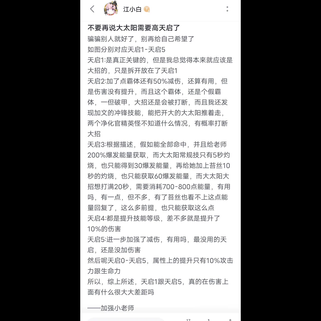 所以我说,天启3,也就加了1.5-2秒滋,打拟境可以秒boss的,也不缺这2秒了,只能算锦上添花 而且必须命中,灼烧目标,命中黄甲也不加能量 然后,如果是满能量开大,天启3作用就更小了,因为前面几秒能量是溢出的,完全浪费了至少5秒能量 偷下懒,把我今天发b站的视频拿过来 ——加强小老师
