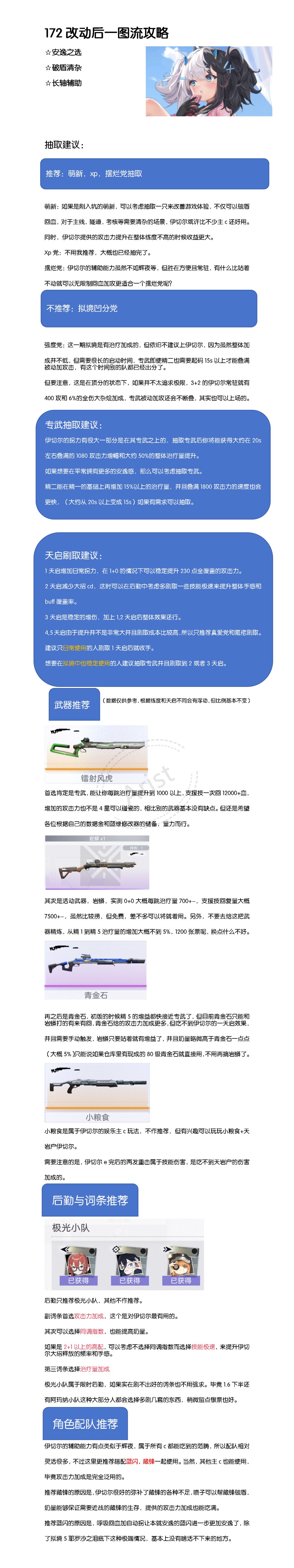 卡池方面的话保底新人实际需要四十抽!且不能单抽,连抽八抽等于十抽!目前我感觉我要保底了,已经抽到三十抽了! 常驻池和up池需要八十抽保底,枪类需要六十抽保底!据说是百分之零点七的爆率,嘎嘎低! 类似与某神一样的抽卡机制,之前某原是把把保底!希望别搞这种东西,也有可能是我脸太黑了。 枪类是可以定向的,出现你定向的枪出的概率大幅度提高📈!但是目前来看,出石头的数量太少了。感觉关卡全通了也顶多保底一金(