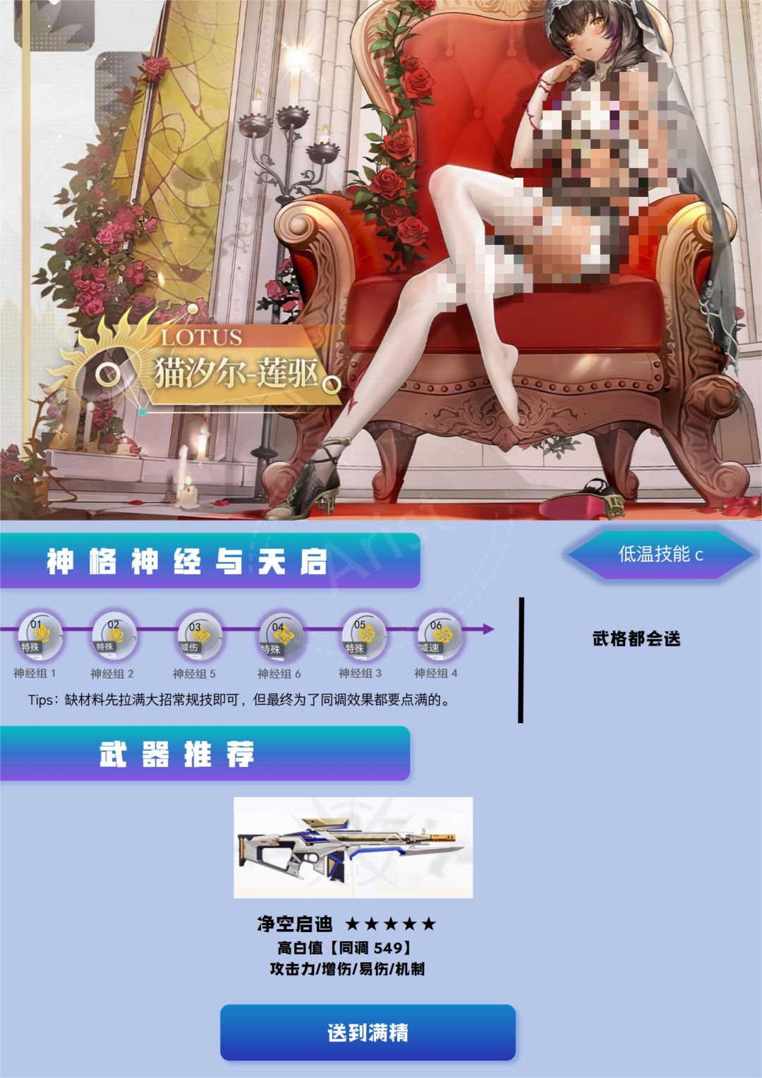 大家好啊,这里是迫迫人!本期为各位分析员们带来尘白禁区【猫汐尔-莲驱】的角色攻略(攻略内容仅个人观点非最终结论,仅供参考!如有补充和疑问可以在评论区留言;未经允许,禁止转载🚫) 本期攻略目录如下: ★一图流展示 •角色技能介绍 •角色神格神经 •角色天启加成 •角色武器推荐 •角色后勤选择 •角色配队调整 前言猫汐尔这次由本人亲自参与,协同着研发部共同开发,该战术套装配备了以“水之影”为外观灵感的