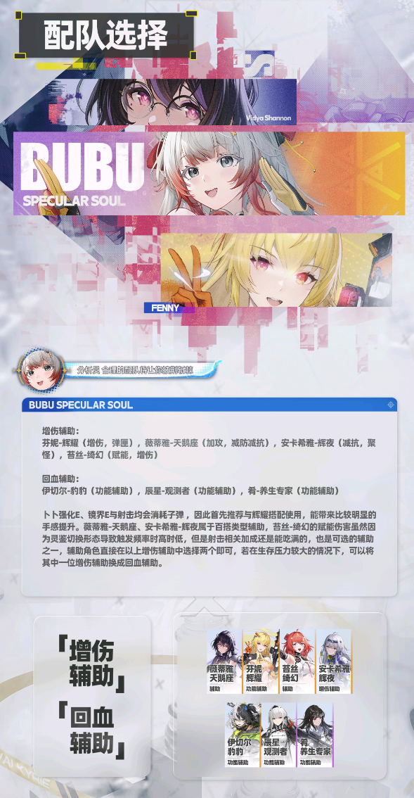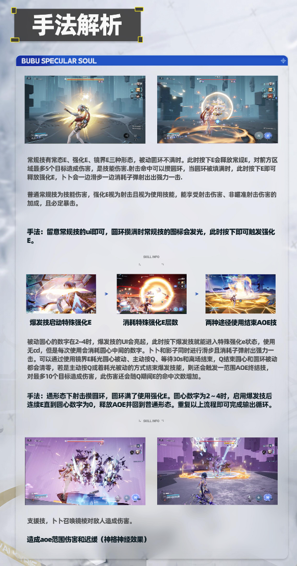 卜卜-灵鉴是使用双枪·冲锋枪的特异类型伤害的射击输出角色。战斗中,卜卜在现实世界里通过普通射击累积【镜晕】使常规技升级为【镜彩射击】,释放【镜彩射击】来累积【溢光】,达成爆发技释放条件;【虚镜】世界中,卜卜的常规技升级为【镜裂射击】,主要通过消耗【溢光】释放【镜裂射击】造成伤害,【溢光】消耗完毕后回到现实世界。“有分析员陪着,卜卜一定能成为厉害的大天师!”※部分机型可能会存在动图显示异常情况,