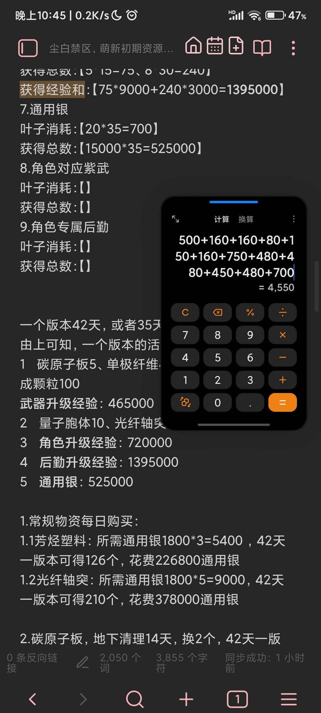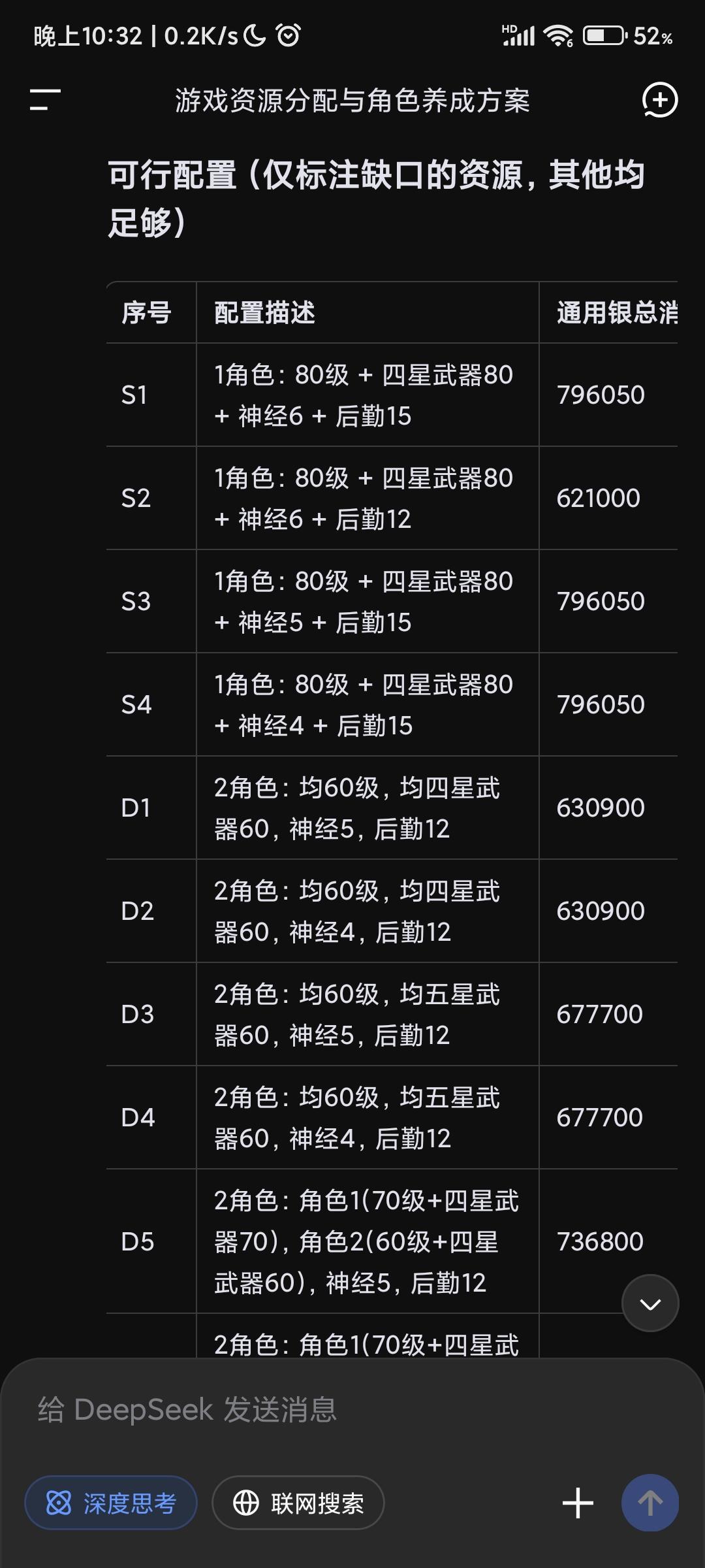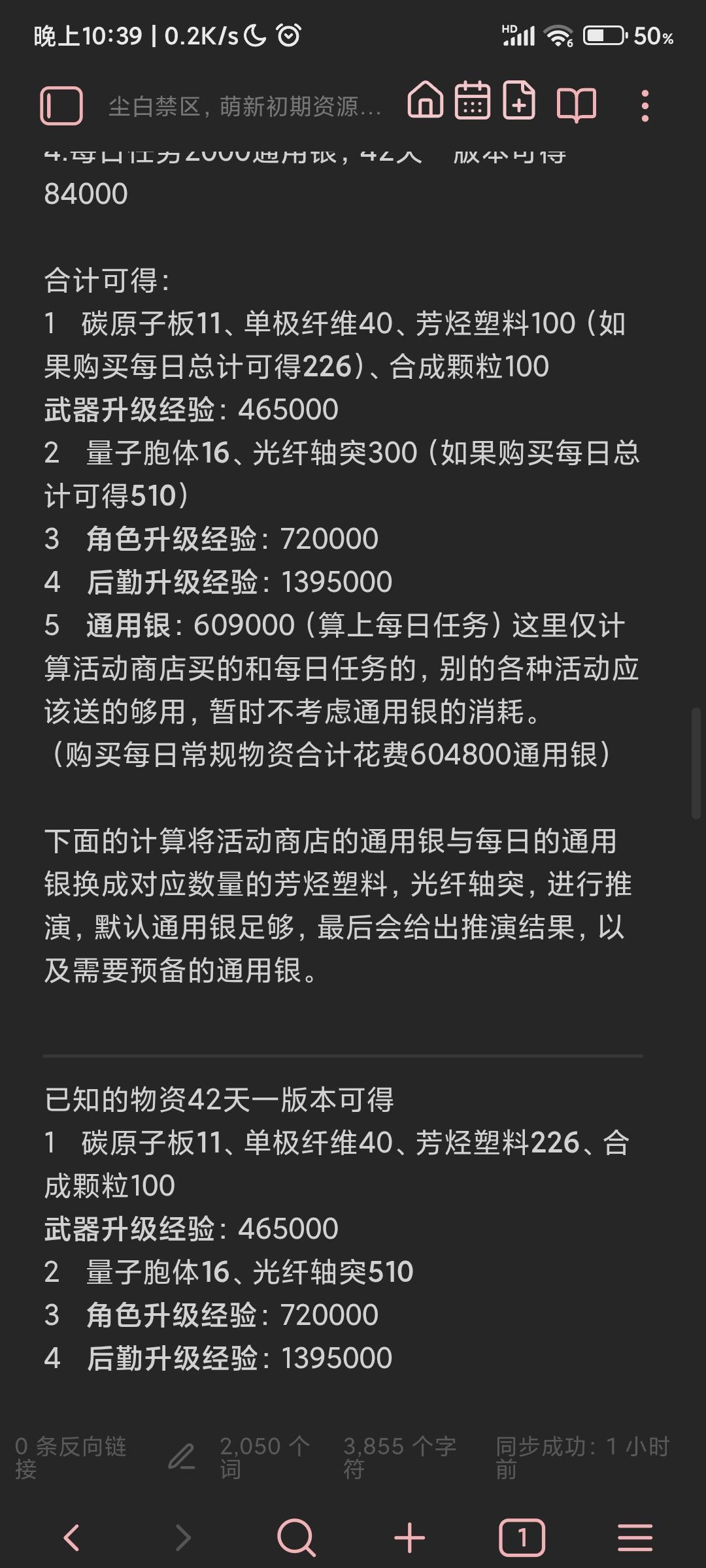 搬完活动商店升级材料+每日买塑料跟轴突+拟镜、地下换的碳原子和量子+每日任务的通用银为所有假定的养成资源。感兴趣的看ai的推演,如有错误或者遗漏请各位请大佬指点https://chat.deepseek.com/share/f4ua8t0uownkivx29w今天就先这样吧,还没算搬完商店的升级材料体力消耗跟天数,大概是16.8天,不算重修,没验算明天再看,文章先鸽了看心情再写。