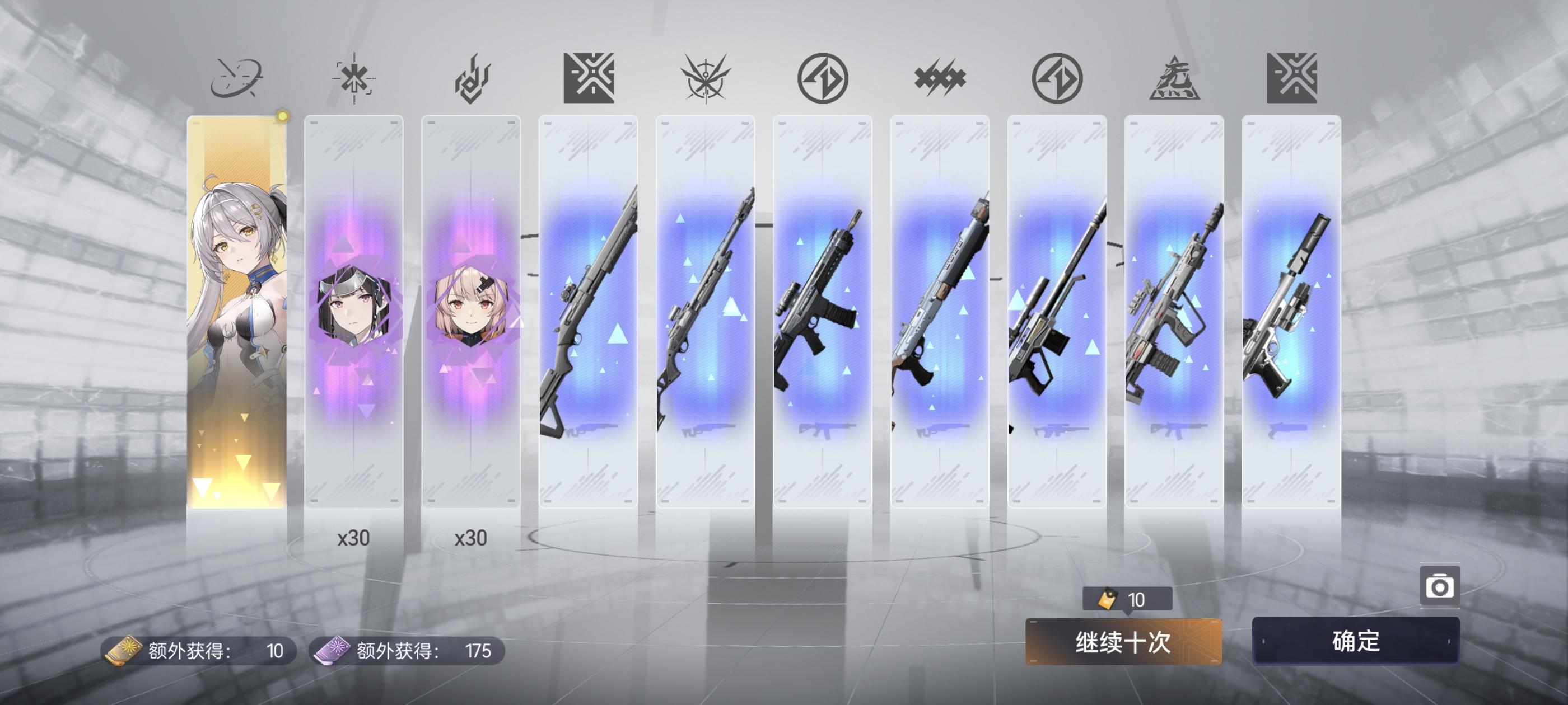 玩了近1年一直以为必出池需要至少85-99抽出金,未曾设想一发十连也有概率直接出(上期累计1/100,没有垫池子),专武池从入坑用票到现在攒了70也出货了,这高低得买个皮肤套装纪念一下。新春佳节将至,提前祝全体大佬萌新都能一发入魂
