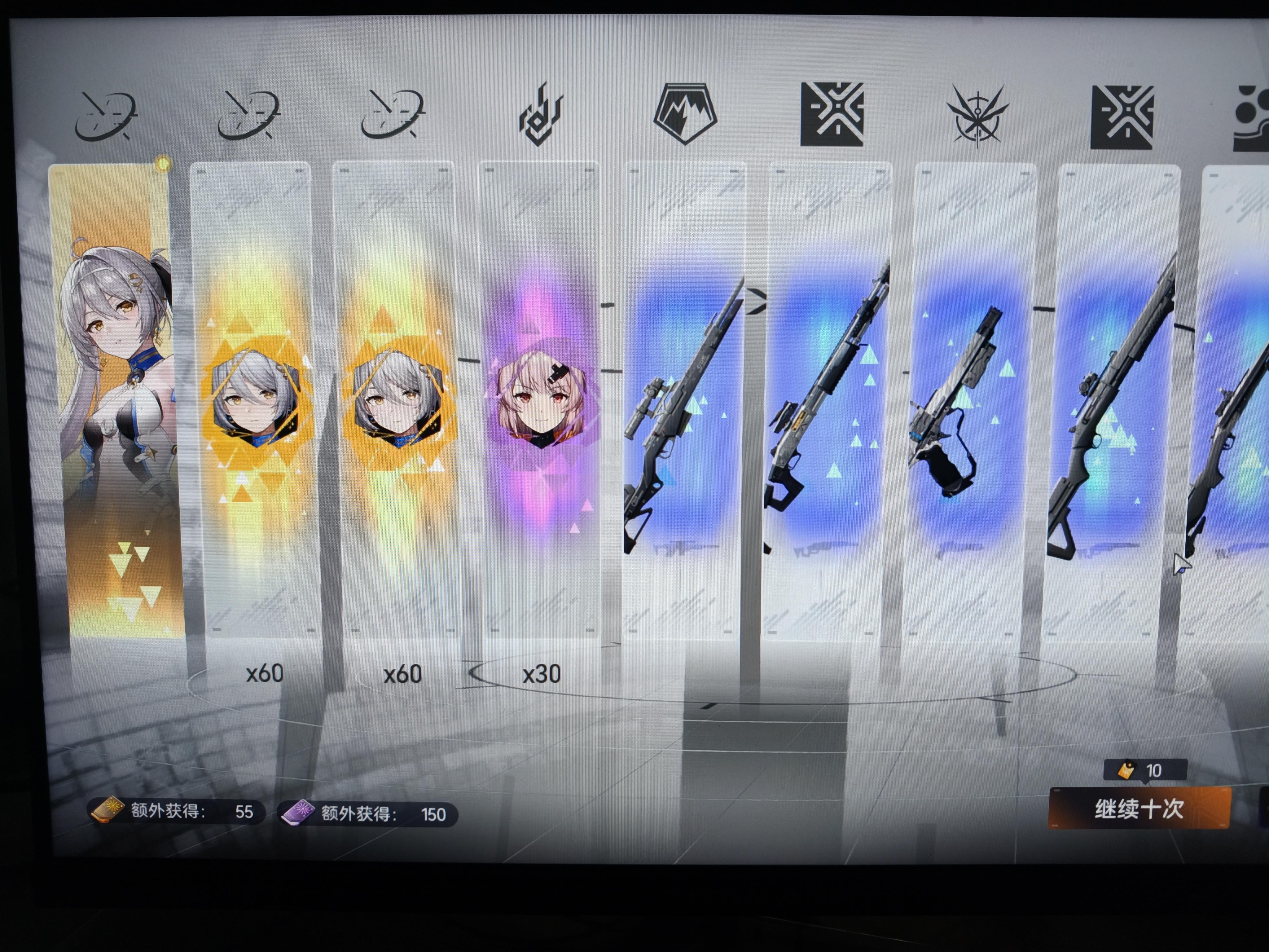 玩了近1年一直以为必出池需要至少85-99抽出金,未曾设想一发十连也有概率直接出(上期累计1/100,没有垫池子),专武池从入坑用票到现在攒了70也出货了,这高低得买个皮肤套装纪念一下。新春佳节将至,提前祝全体大佬萌新都能一发入魂