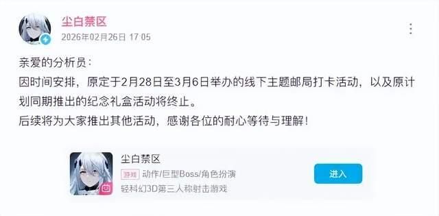 西山居旗下成人向游戏《尘白禁区》与中国邮政的跨界合作,在官宣48小时内因舆论压力紧急叫停。原定于2月28日在五座城市邮局开展的快闪活动全面终止,限量1500份的联名礼盒取消发售,各地邮局已连夜撤除宣传物料。中国邮政作为覆盖全年龄层的国民级国企,其服务网点每日接待大量未成年人及中老年群体。网友直言"在传统文化场所办擦边活动极不妥当",尤其成都衣冠庙邮局(相传为关羽衣冠冢所在地)的联动选址更被批"亵