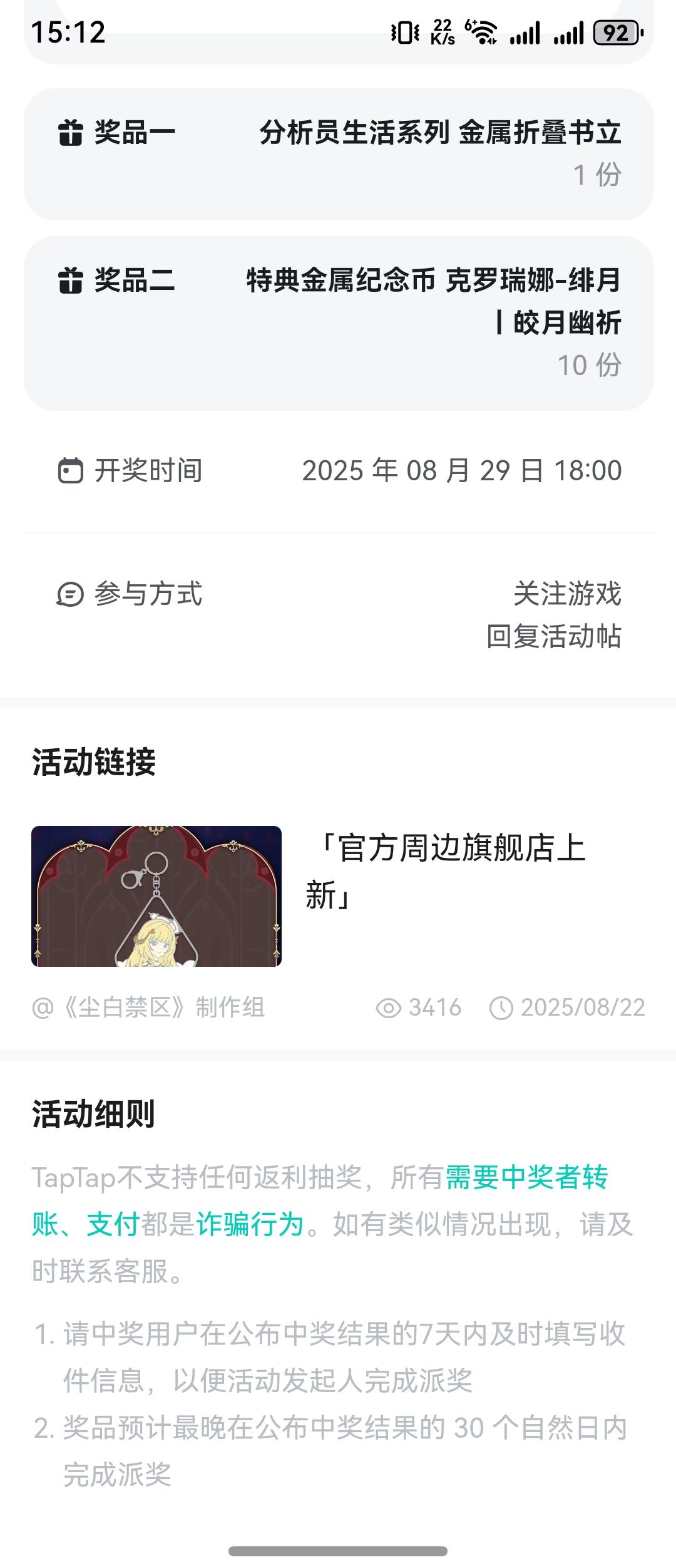 回去翻了翻记录,居然是8月份的抽奖,12月30日发货。。尘白大概是忘了