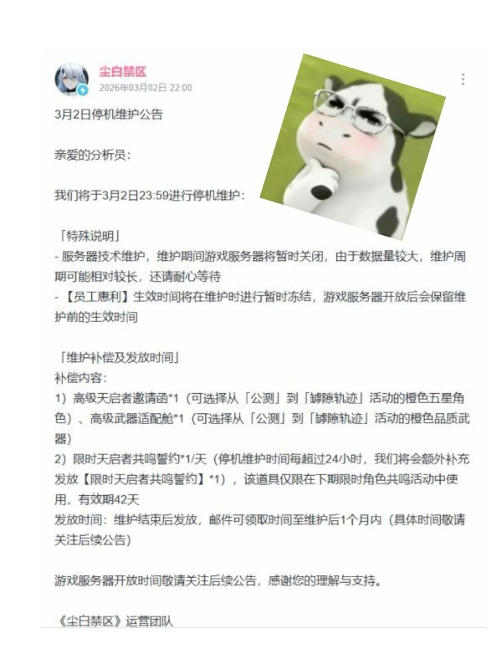 一、我话放这里了,不信的话可以截图等着打我脸,我绝对不删帖。尘白肯定能活!开服、2.3都挺过来了,这点真没啥的停机最短几天,过了时间点再说。最长应该就是3.6前一天了(不过这次停机,如果没能过来,只剩下国际服的路的话……算了,我一个人贷款赤石就好了!)二、公告省流&个人感受(1)省流:①月卡天数保留②明天开始算,晚一天开服,就给一张限定角色票(限时的