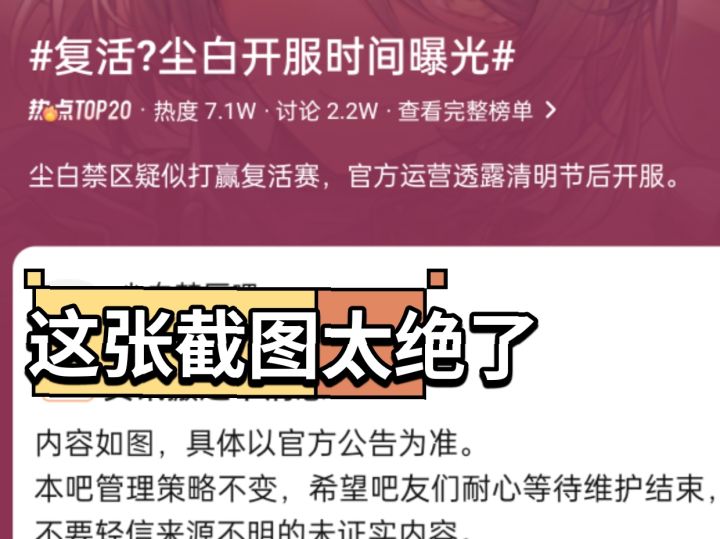 禁区这回疑似要打赢复活赛了!由于大家的坚持在官方群有运营透露清明节后开服。消息一出,迅速冲上热搜,贴吧热度破万 此 游戏毫无预兆宣布无限期停服维护,只说“数据量较大,维护周期可能相对较长”,没给具体时间。 玩家都等麻了,天天四处打探消息,追问官方人员, 开服时间更是一推再推:从三月推到四月。 又从四月初拖到清明后一周,耐心快磨没了。不过有个好消息,和谐问题大概率不会有,有人问了海南文旅,没