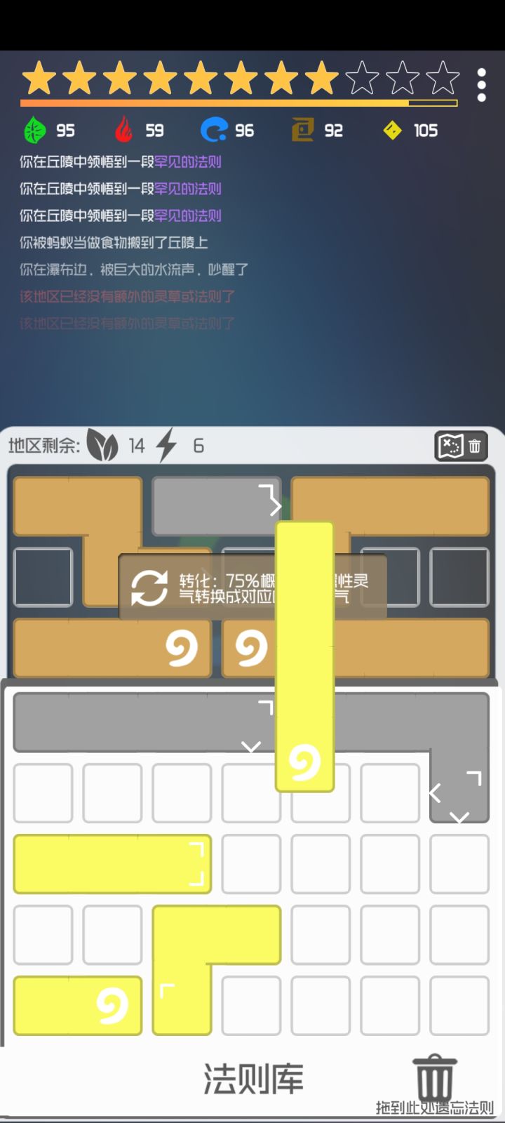 1.1 法则类型>无色法则此类法则75%将经过的有元素块转化为无元素块>吸收法则即终端是漩涡图案的法则。此类法则遇到同色素块必将其移动吸收,而遇到无元素块则75%转化吸收。需要说明的是,无元素块经过此类法则终端时不会转化吸收。>元素法则遇到无元素法则75%转化。1.2 基础规则>元素块由经过法则整体的第一次进行75%判定。 图1.2.1左上角第一个法则只能在上面部分吸收元素块。