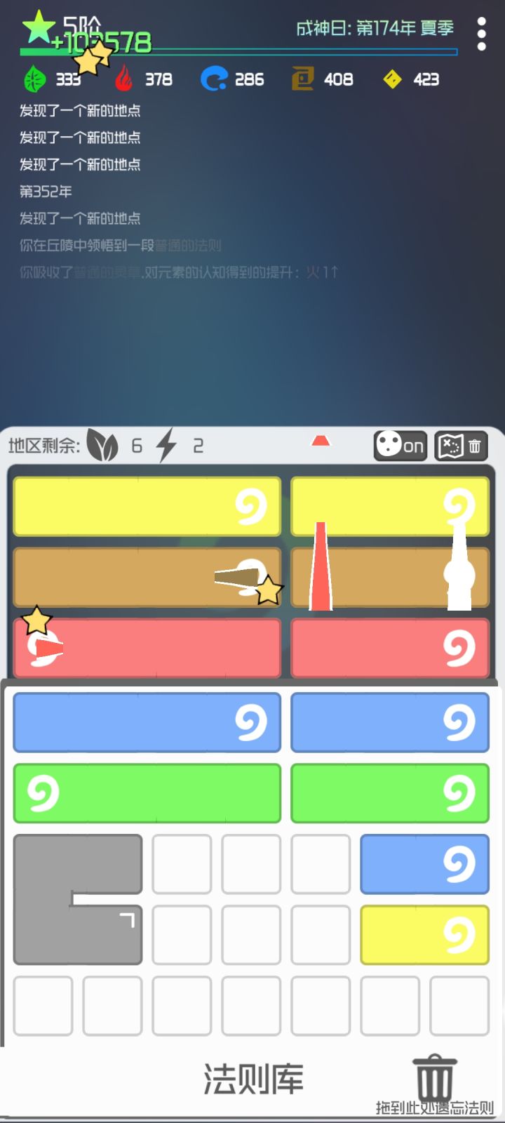 三色地图全解决。合适的无色好难攒(位置不够扔了好多),目前没用的法则可以放在地上不捡,给法则库省地方。可玩性变低了,到底要不要换地图,主要新地图收益貌似也比挂机高不了多少,唯一的目标可能就是弄无色,但是感觉还是会漏,强迫症感觉很难受,还不如找个100%单修。