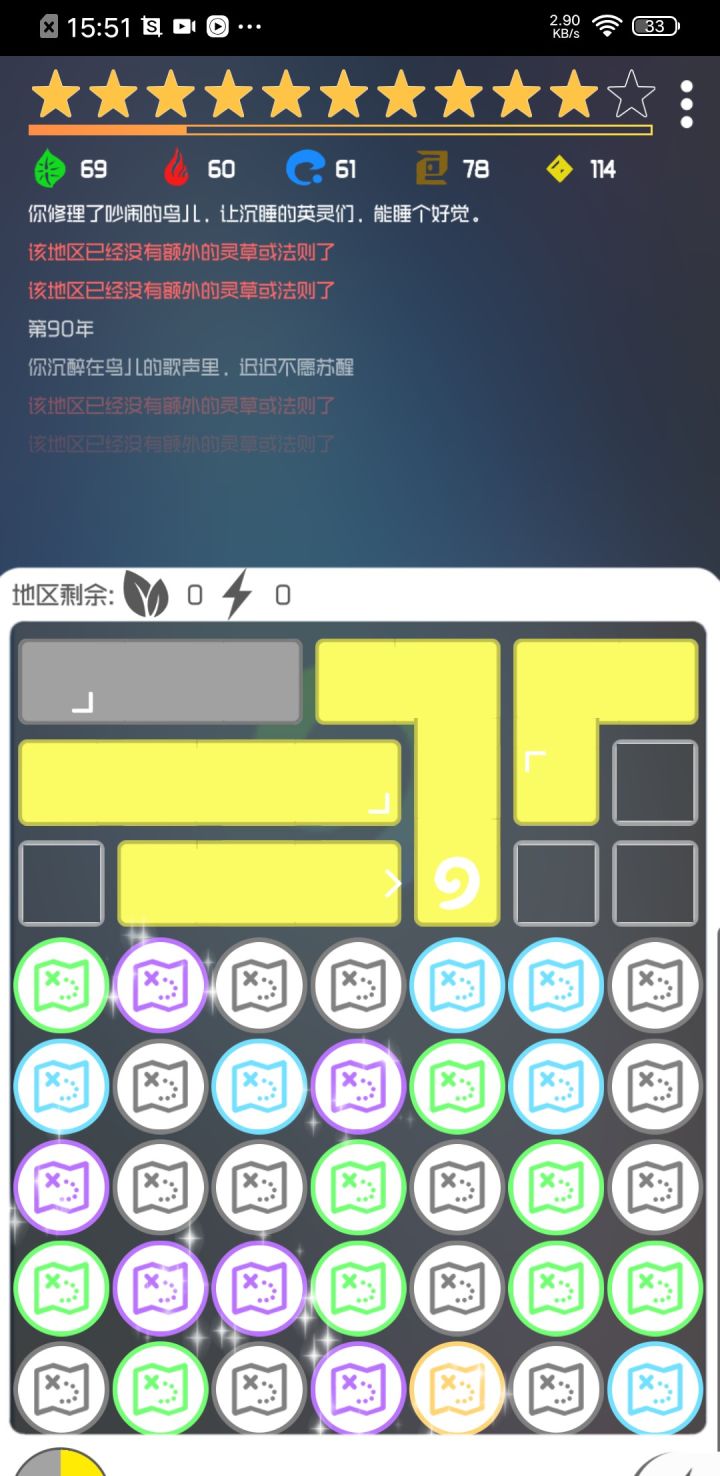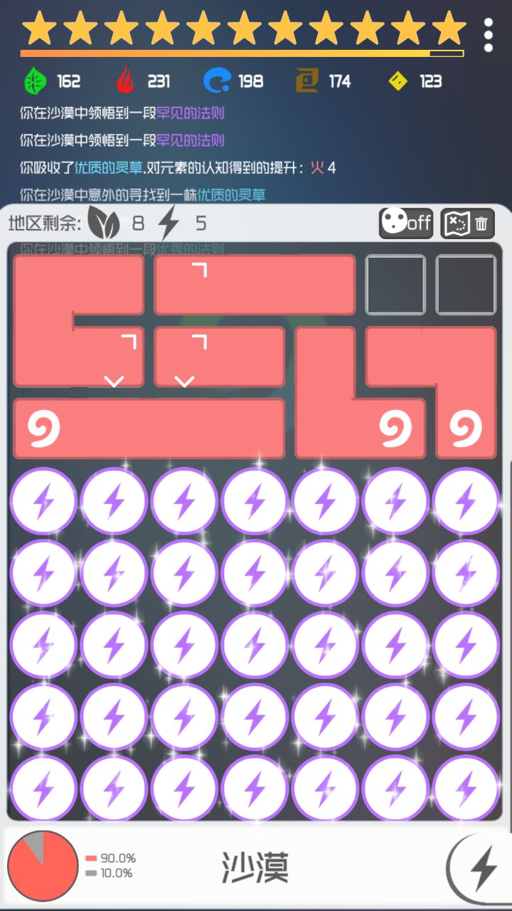 相信大家才打开这个游戏和我一样一脸懵,我就玩了一下午,虽然没玩到多少阶,但是有些建议和说明萌新看了至少可以有点头绪,第一次写这么长的攻略,麻烦点个赞,感谢。。1.五行就是界面上面金木水火土对应黄绿蓝红棕五种颜色,它们的数值就是你每消一个得的经验。2.地图地图的作用是当没有资源(闪电和树叶标志)时可以换另一个地图,等级越高的地图资源越多,地图上面的比例就是五种数值刷新的概率 3.闪电⚡闪