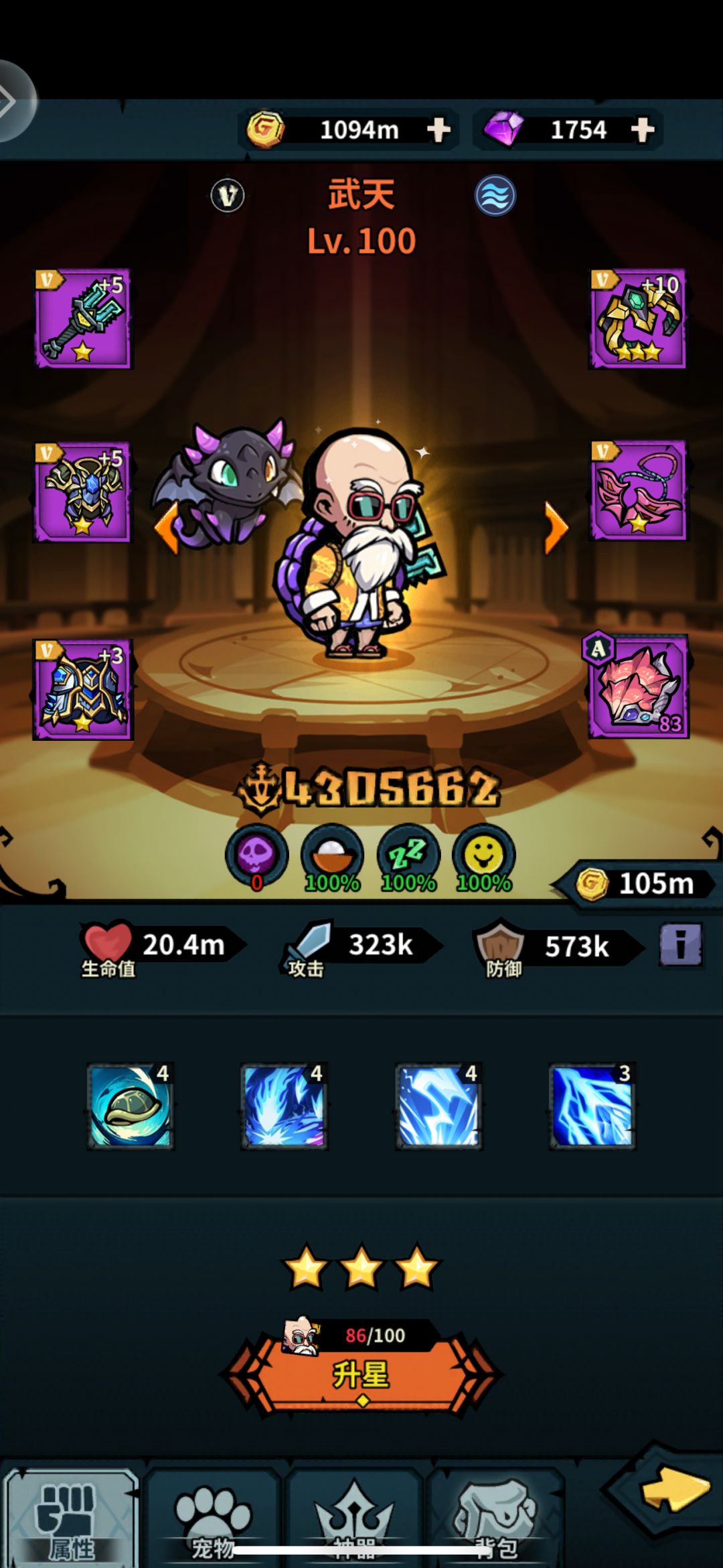 经过一个多月的游玩,我的阵容基本稳定,这个阵容目前感觉pve推塔还是挺不错了,今天过了400层,作为个例子和大家分享一下。 目前这套阵容战力是139w,阵容如下: 10星青龙+10星追魂+8星玄武+10星狐妖+9星伏羲 这里除了玄武8星是必须,其他的星级越高,容错率越大 关键速度速:青龙1速,狐妖2速,玄武3速(视频因为pk带了先手,所以乱速了) 关键神话卡:双龙锁 关键装备:青龙和玄武带曜,概率大招减一回合 关键魂契:玄武概率大招减一回合 配队思路:玄武大招刷新青龙的控制和狐妖的推条,玄武只要减了一回合大招,就能保证出发80%的冰冻,也能有效补充对对面的控制。玄武大招还能减少对面攻击力,即使有一次没控制完美,也可以增加容错率。追魂的混乱和双龙推条主要保证对面青龙和女娲不出大招。然后就是拼概率流血了。 由于越战,命中是很感人的,因此需要大量的次数拼概率增加容错率,只要没控制好对面青龙,到了400层基本就会团灭。