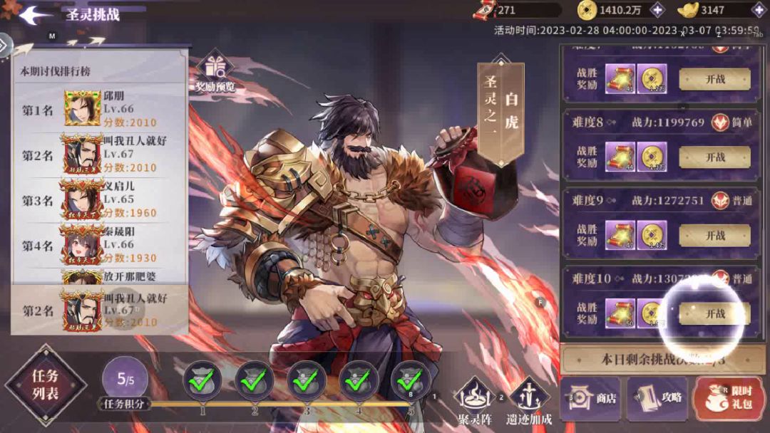 苍兰联动悬赏通关攻略篇第十三天 ——太季篇 今天的悬赏难度依旧在线,双盾、软控、硬控,再加上嫦娥的治疗、清减益,难度直线上升,建议可以从禁强入手,优先处理嫦娥。 阵容1苍兰体系:东方青苍+小兰花+青龙+昊天+太羽 击杀顺序:嫦娥——追魂——低智商——李靖——太季 优先集火嫦娥,之后可通过配合怒气技再杀一个,剩余三个每回合有两个禁强,东方青苍压低血量,昊天斩杀即可。 附图 阵容2人灵混搭:李靖+