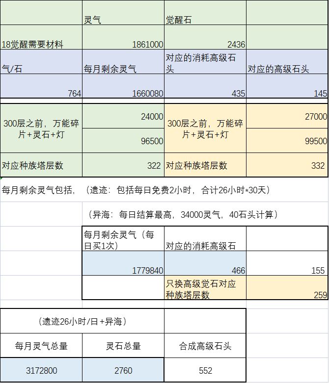 以上是根据每月固定收益(遗迹、种族塔的) 遗迹产出的气/种族塔产出的石头 来测算 缺气?缺石头? 总结: 万能/灯/天命石/ 全买: 2790=279层种族塔 只买石头:209层后就缺气, 如果加上其他活动途径获得石头呢?(比如超级幸运锦囊、访仙等) 200层不到就缺气了。 不需要买这么多高级种族石头。 换完125个高级种族石头就够了 作者刚好处在这个边缘,怪不得缺灵气!!! 重新整理:算上异海其