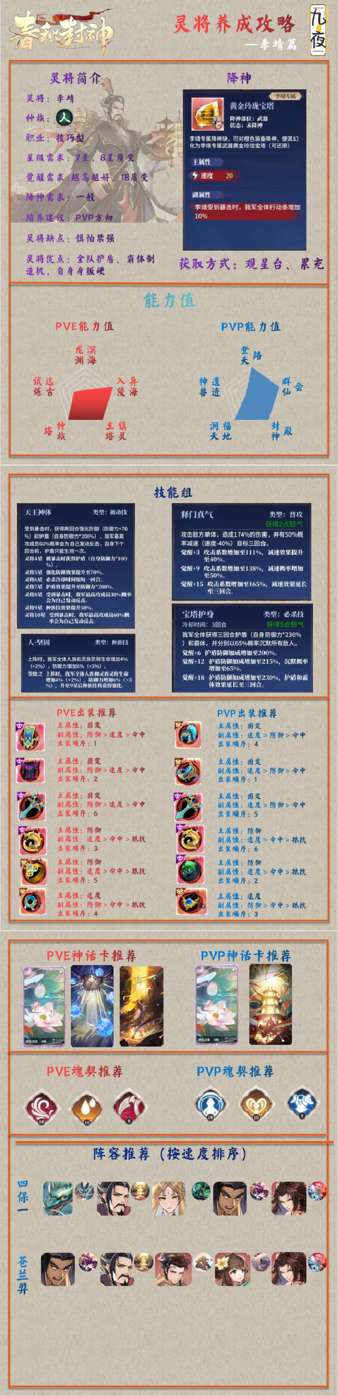 本来想做一图流推荐,奈何作图水平有限,还是打字来的实在。 这期为大家推荐李靖的养成攻略。 1.装备推荐。 头盔: 神凛。 主属性:固定 副属性:速度(必须)、命中、百分比防御(抵抗) 对方减条加上自身清减益,增加了自身的生存能力。 为什么不选择曜?李靖觉醒18的时候盾和霸体持续3回合,CD3回合,是无缝衔接的。 衣服: 神水镜/神凝血 主属性:固定 副属性:速度(必须)、命中、百分比防御(抵抗) 之