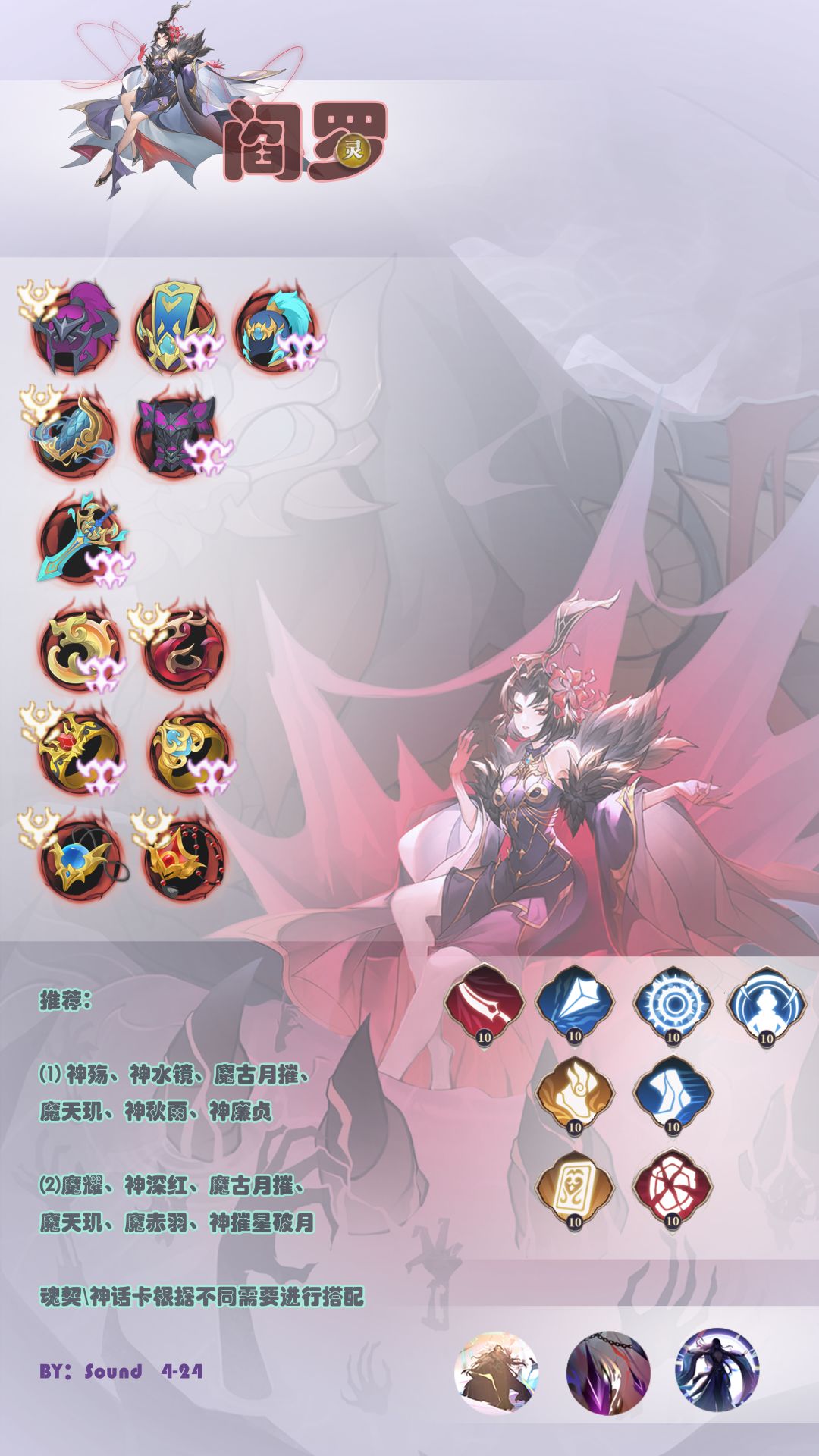 阎罗活动还没结束我先来浅析一波。 首先,美工好评! 其次阎罗的机制,与追魂CP,这个游戏官方第二对CP。 被动1:所有攻击都将伤害20%抽离敌人生命值,抽离的生命无法恢复(10星40%抽离) 主动攻击:单体,抽离效果35%。与被动叠加后达到惊人的75% 被动2:回合结束清除自身跟追魂两个DEBUFF,100%潜行(7星) 生存向,如果回合开始就很强。(PS 净化青莲还是那么强) 针对性: 阎罗的输