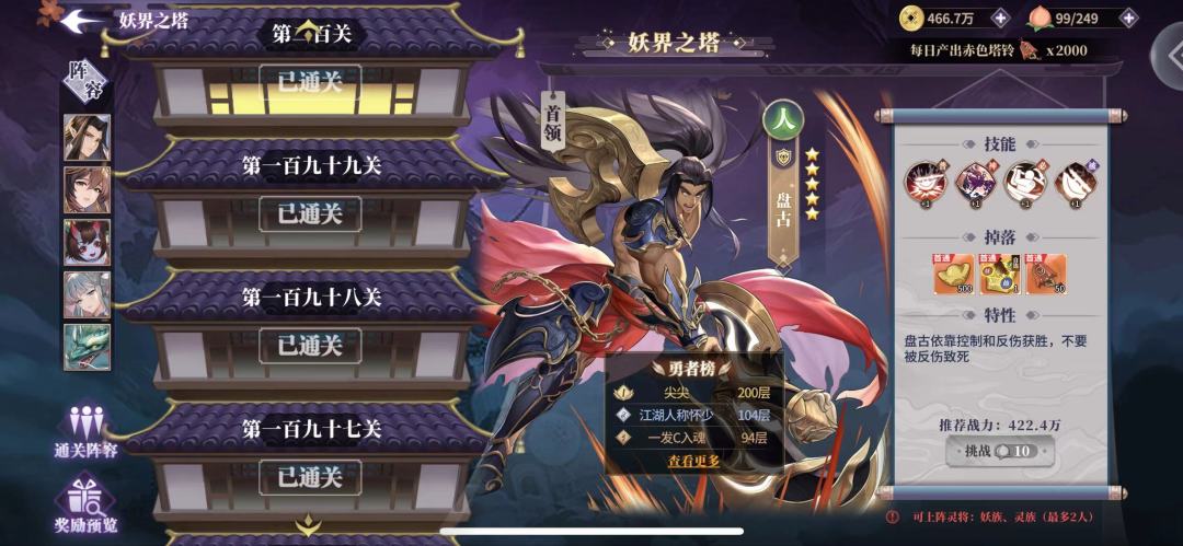 妖塔145之后登顶阵容、欢迎大佬们指教,相互学习 215万挑战422万 感谢!南宫瑾娴 (官方攻略组大佬)对我的指导!再次感谢! 南宫瑾娴 传送门 :https://www.taptap.cn/moment/382450825491908010 实战阵容如下:务必高速!高命中!肉! 狐尊(破魔狐灵)、 灼烧队(龙渊幻音) 女娲(饕餮)、灼烧队(净化之风) 鬼娃娃(太极法阵) 青龙(青龙怒涛)、灼烧