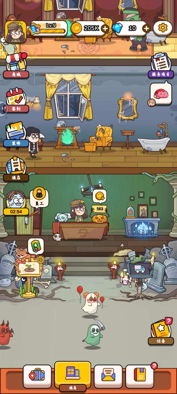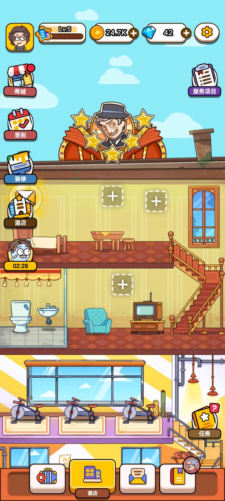 整体是好玩的,而且莫名其妙地上头,光看广告解锁酒店服务人员就解锁了三个,起码看了三十个广告,装修替换家具也是,现有的每个家具都解锁了,换了对应房间主题的套装,又是十几个广告
