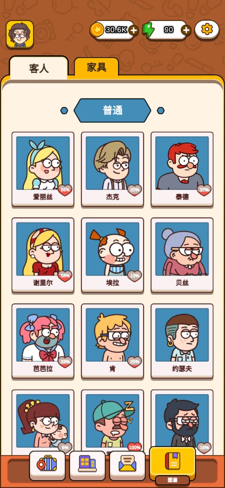 经营部分,酒店真的很有意思,除了解锁房间,替换家具以外,还会有顾客收集图鉴,然后会有不同顾客需要的物品不同的设定,就是经常缺货,所以要看广告获取顾客需要的物品