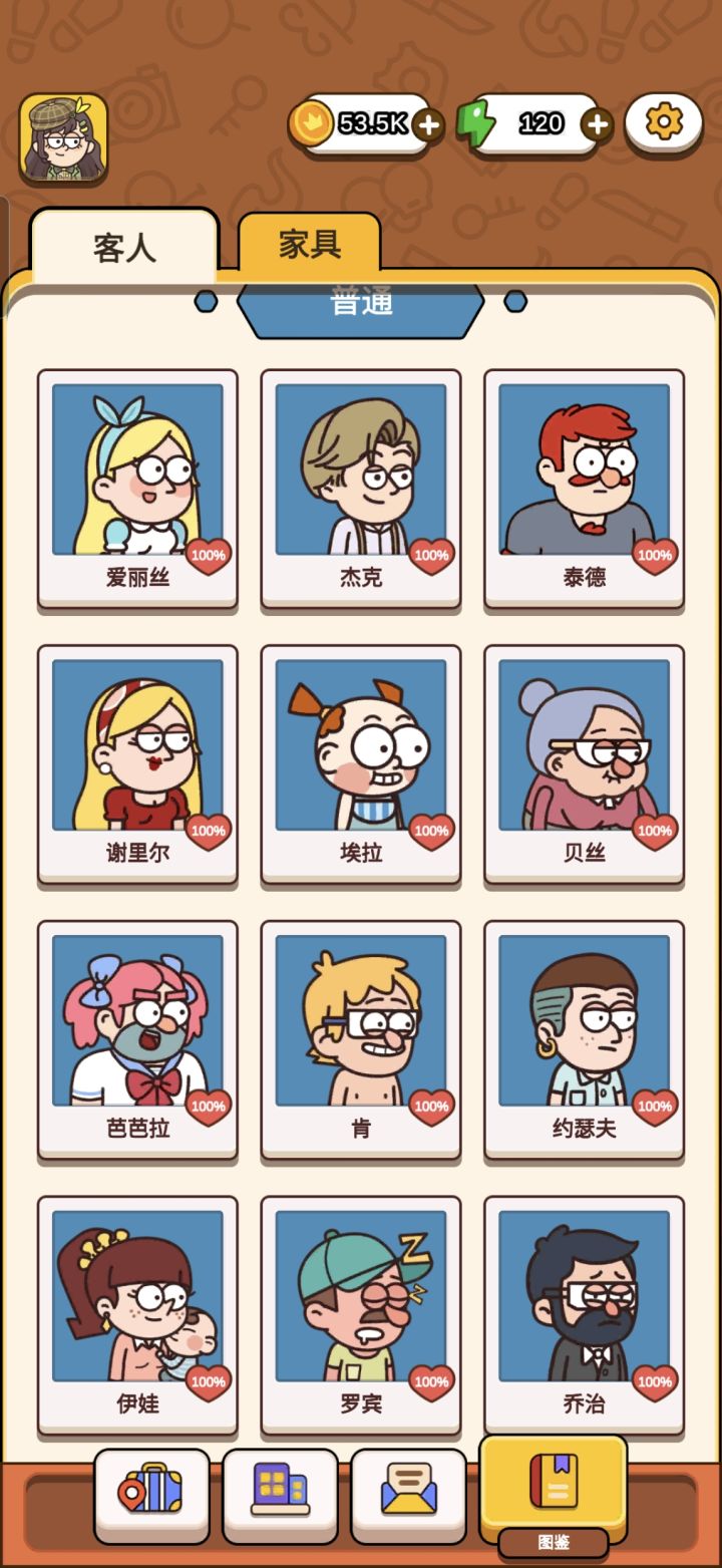 经营部分,酒店真的很有意思,除了解锁房间,替换家具以外,还会有顾客收集图鉴,然后会有不同顾客需要的物品不同的设定,就是经常缺货,所以要看广告获取顾客需要的物品