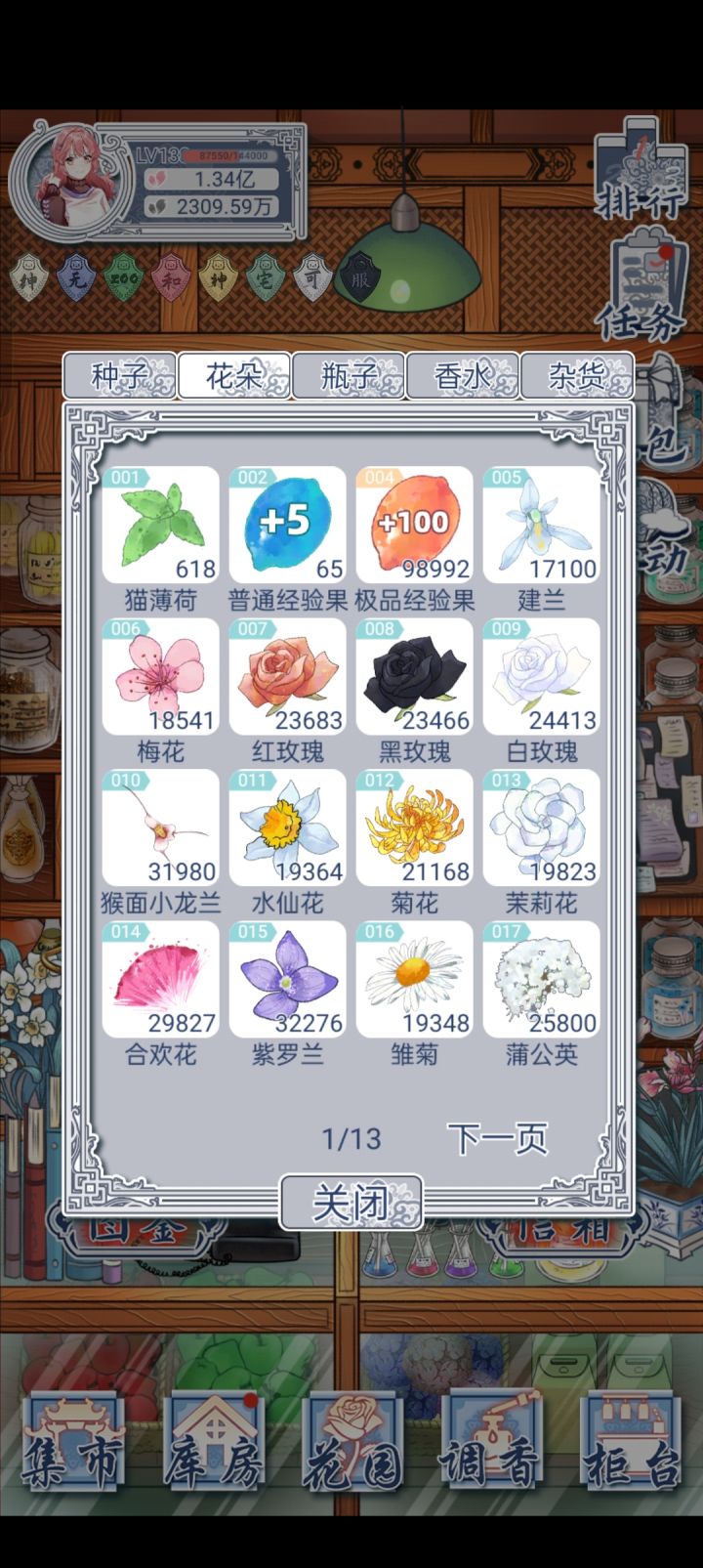攒了一些本金之后可以去做红房旧事(需要红玫瑰黑玫瑰和金桔,瓶子是玩偶兔,瓶子价格刷到500多比较好,达到特级的售价是1500多)我现在果香调都四星了还在拿红房旧事刷粉花瓣,粉花瓣多起来之后可以重复购买配方增加熟练度以快速增加香水售价(前期不推荐!)