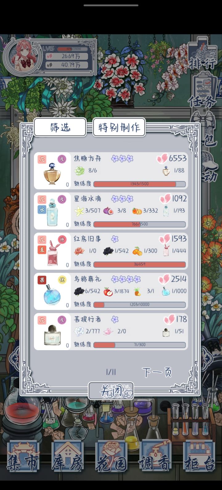 然后是调香等级的升级,把一个香水做到特级之后就能进行考核,考核通过就升级调香等级,就可以做更高等级的香水了!如果想快速升级,就做材料成熟时间短、种类少的的香水吧!
