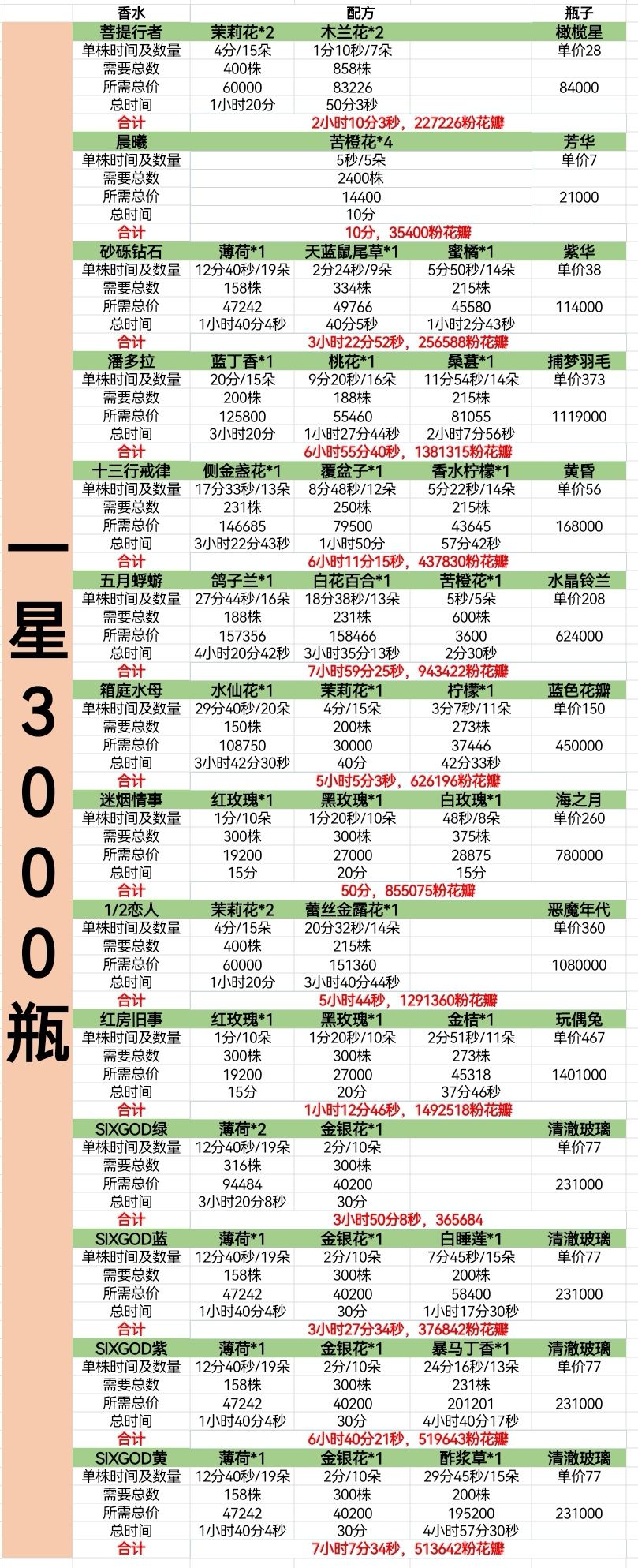 水瓶座活动攻略虽迟但到,希望还能有用 过年前太忙了,本以为过年可以整理一下的结果过年比年前更忙😭来迟了dbq!!给宝子们拜个年祝宝子们新年快乐兔年发财😘😘😘 🙋计算了花香调香水的完成时间和花费 对数据做一下说明: 1、单株所需时间及数量是假设无土地加成的数据,也就是一级都没有升级的情况下的。 2、总时间是假设有20块土地且20块土地在同时都种植这一种植物的情况下算的。 3、瓶子的单价是目前刷到的最低价的价格 4、五星香水基本上都是极品种子,没有种子价格,这个我觉得只能是自己库存有哪个就做哪个了。。 5、表格里所有数据都是基于一个连续操作一秒钟不耽误的假设算出来的,只是一个理论上的数据,仅供参考一下可完成性和性价比 6、我个人的推荐 一星:晨曦(时间最短消耗最少,但香水价格本身低);迷烟情事/红房旧事(时间相对短,花瓣消耗相对少,香水价格比较高可周六双倍上架) 二星:懵懂情事 三星:星海水滴(时间短消耗少)/时雨音色(适合刷周六) 四星:云海漫步或者琉璃骑士(时间短但黑花瓣消耗多,香水价格高适合刷周六)/无趣绅士或花间月下(时间短黑花瓣消耗少,价格略低也可以刷) 五星:忘尘(时间短,不消耗极品种子,但黑花瓣消耗略多,唯一可以刷周六的5星香水) 7.关于星座活动的一些想法 首先,刷任务是第一步,我个人是刷时间短的,然后尽量刷4星考5级,如果差太多我就不考5级了也不强求。 第二,每天做订单攒黑花瓣,差不多周五大量做香水,周六上架双倍爆刷粉花瓣,周日旅行日刷需要的极品种子 第三,如果喜欢收集喵装和徽章,星币就优先买盲盒。如果对喵装没兴趣,星币建议买黑花瓣 第四,应该没有人用5星香水刷周六双倍吧,可不划算昂 如果有我漏掉的还没有拥有的香水配方,告诉我我再继续补充🙋🙋 希望对各位宝子有所帮助 btw,因为今年工作和个人规划会变成一个妥妥的现充,所以趁着这几天会把还没有整理过的果香,木香,东方香,绿叶香,柑橘香香水全部整理出来。