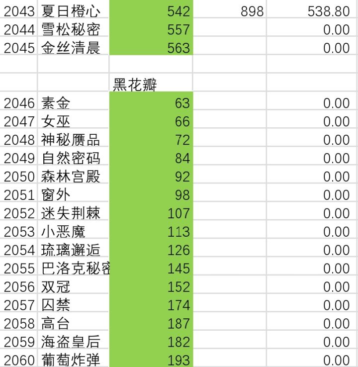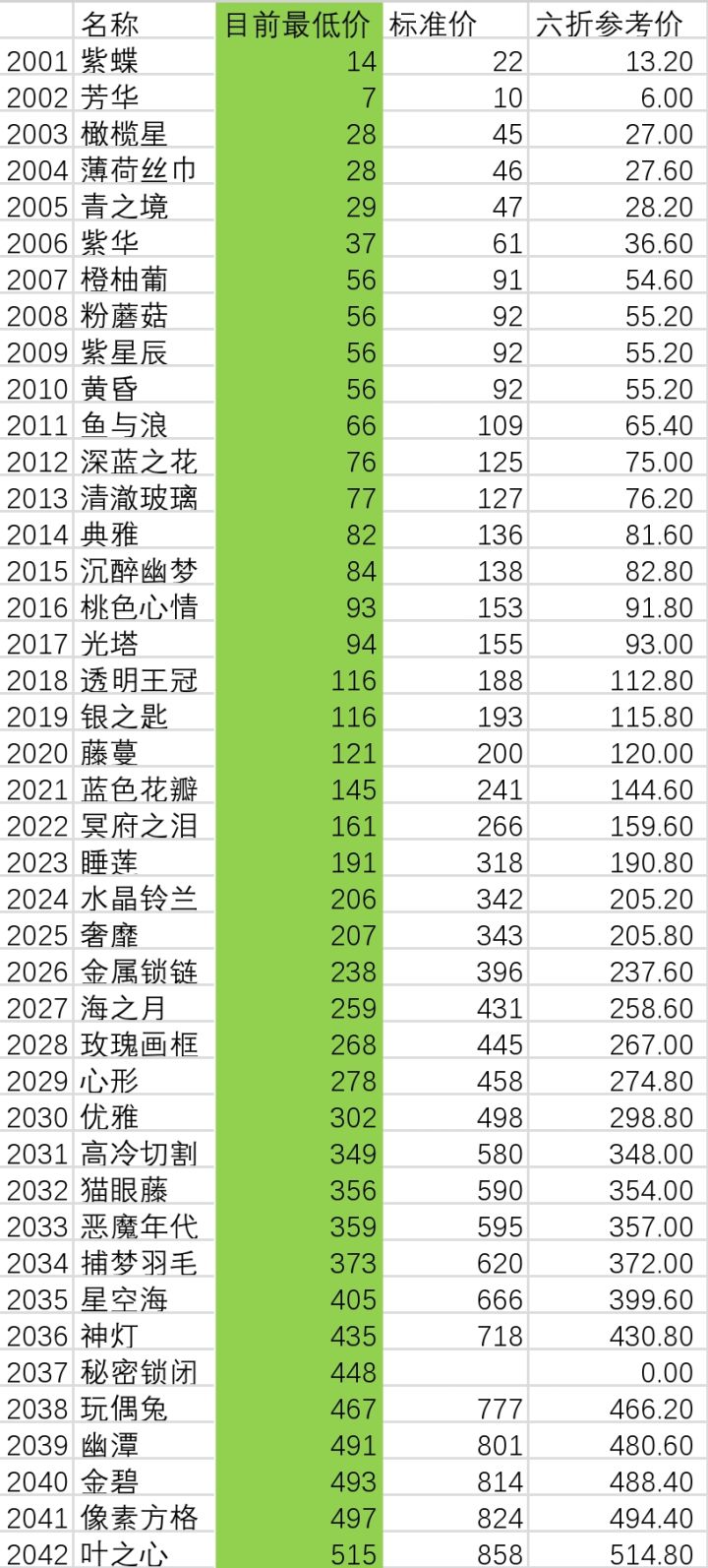 大佬许久未更新,评论区好多新低价,翻着麻烦,依据大佬表格以及评论区更新了一下。///如果要提供新低价,请发截图哦///六折参考价很准确,希望有看到秘密锁闭、金丝清晨的标准价的朋友提供一下线索,谢谢。一个小建议,由于越高价的瓶子想要刷到最低价就越难,很多时候不必太纠结,序号2031到2045的瓶子与最低价差价10块以内就差不多了。关于雪松秘密,我纠结于它的最低价,在刷新界面犟了一个多小时,至