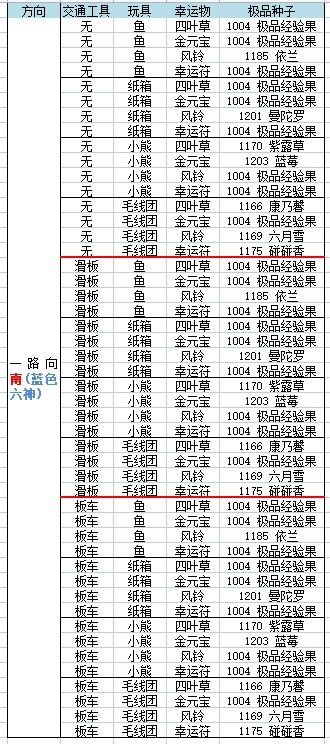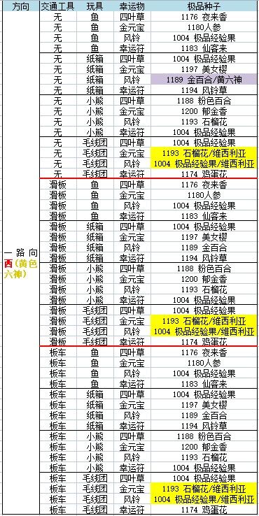 交通工具:无鱼 四叶草 北:天竺葵——–——南:凌霄花,锦葵,珍珠梅—–———西:夜来香,木荷,鲁冰花—–———东:鲁冰花鱼 元宝 北:红掌—–——南:山楂,极品经验果,油桃—–——西:秋水仙,山楂–———东:四照花,藏红花鱼 风铃 北:白色满天星,蕙兰,丽格海棠—–——南:依兰—–——西:极品经验果,仙山红—–——东:糖果雪山鱼 幸运符 北:红袖,秋海棠—–———南: