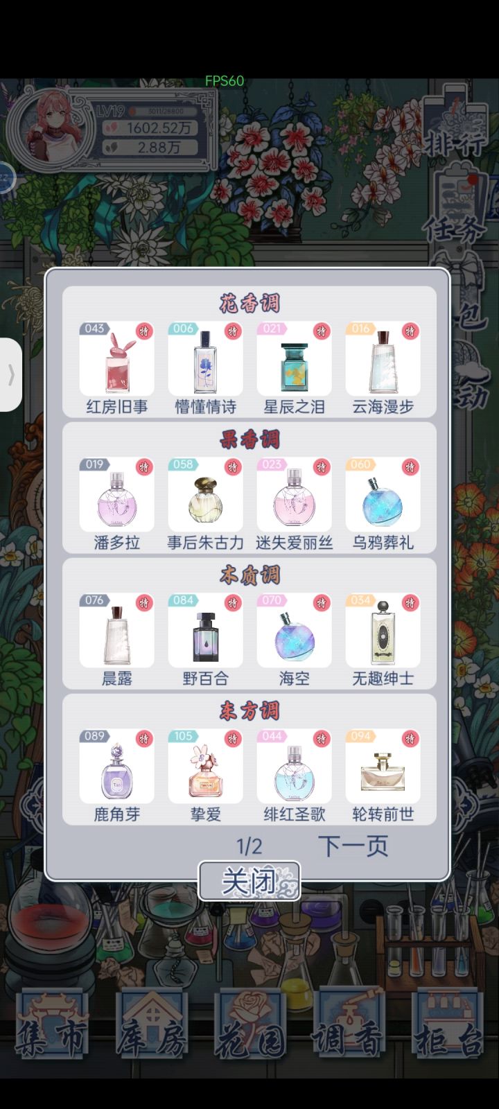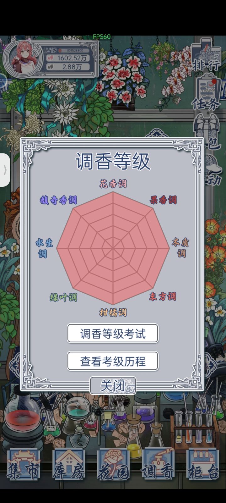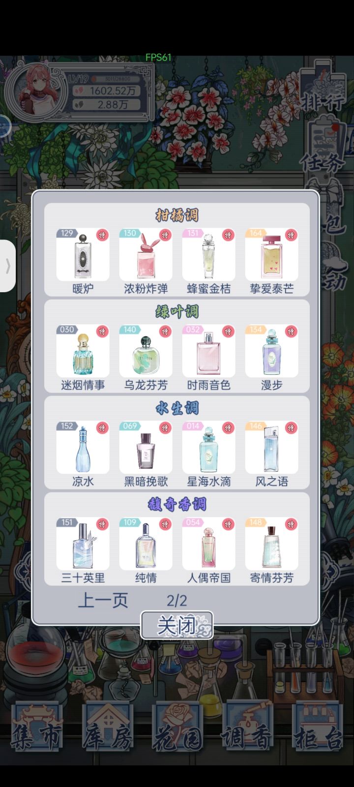 五级毕业!目前香水全收集,准备金盆洗手卸载了。我是一边考级一边研制新品,一开始的目标就是香水全收集(非酋直接放弃收集盲盒),所以活动积分一直是只兑换黑花瓣,全过程没为黑花瓣发愁过。放弃盲盒之后金花瓣需求也不大,不太需要看金花瓣的广告。不过批量制作全程都是刷广告做特别制作,一路升级非常快。