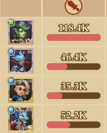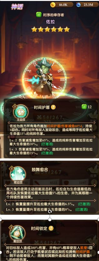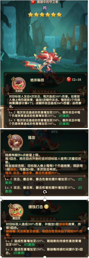 拥有游戏内优秀的多段伤害,自身就可以依靠纹章和号召其他英雄使用纹章技能的辅助完成4BUFF叠加,达到输出最大化,独有的最后一段伤害必然暴击是本套阵容推图的核心,在前图压轴时间凑满BUFF开大输出可以将强力一击带入下一张地图,可以直接重创下图的怪物甚至直接击杀一只,大大减少了前图死去活来,后图无力回天的局面,吾命名本套技巧为偷刀法。