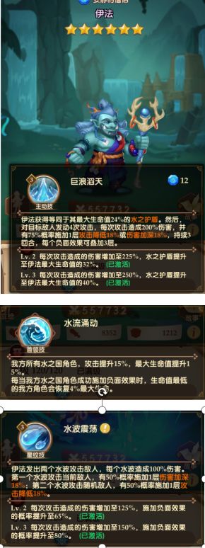伊法为水国首领,其首领技能十分全面,技能加强主力输出鸥的伤害,又能提供可观的血量回复,星纹技和大招疯狂叠加增伤减伤BUFF,可以为鸥快速叠加最大伤害达成条件的同时,自身为坦克属性,大招大幅提升自身攻击力和坦度,是一个合格的多面手。