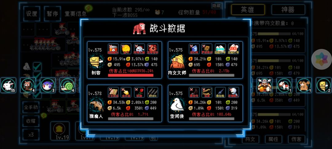 长时间没有玩了,攻略仅做参考 最新更新内容查看请拉到最下面 蜜蜂确实是最适合图二这种挤在一堆的地图,大招提升符文技能系数1200%,最终阿喵造成的伤害异常恐怖!加上本身特殊技能也能享受系数加成,完美契合技能流。 装备符文如图 这里选择穿山甲是因为猎魔穿山甲提供了差不多一半左右爆伤,也就是说提升了主c差不多一倍伤害。 站位如图 猎魔穿山甲靠普攻叠暴击率,所以把它放中间位置正好可以覆盖全图进行普攻,完