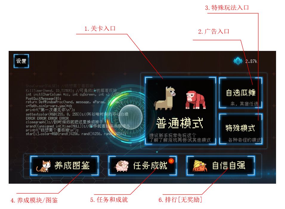 这篇主要是为了聊一下游戏内容,让大伙儿大概有个了解,文章中会牵扯到 1.基础规则部分 2.战斗算法部分 3.特殊玩法部分 开始之前,先做说明: 为啥没有引导游戏内——完全是因为懒,还有做引导没啥意思,做着没劲。 为啥要写这个帖子——因为战斗可能还有点复杂,快两个月了,还是稍微介绍一下吧 开整: 1.基础规则部分 1.1 入口介绍 1.普通模式:从这里可以进入关卡界面 2.自选瓜摊:这里有获取英雄碎