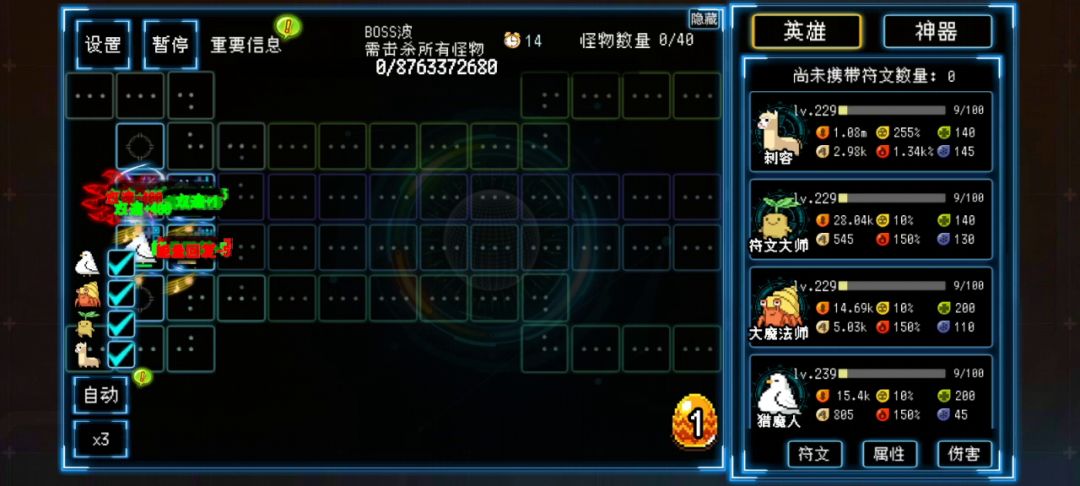 你这玩法太慢了,直接开局鸽子带经验宝宝,其余龙凤童年或者卷轴,人参三件套还有一个觉醒刺客就带技能引导,觉醒别的就带蓝色药水,Boss能撑三秒你找我