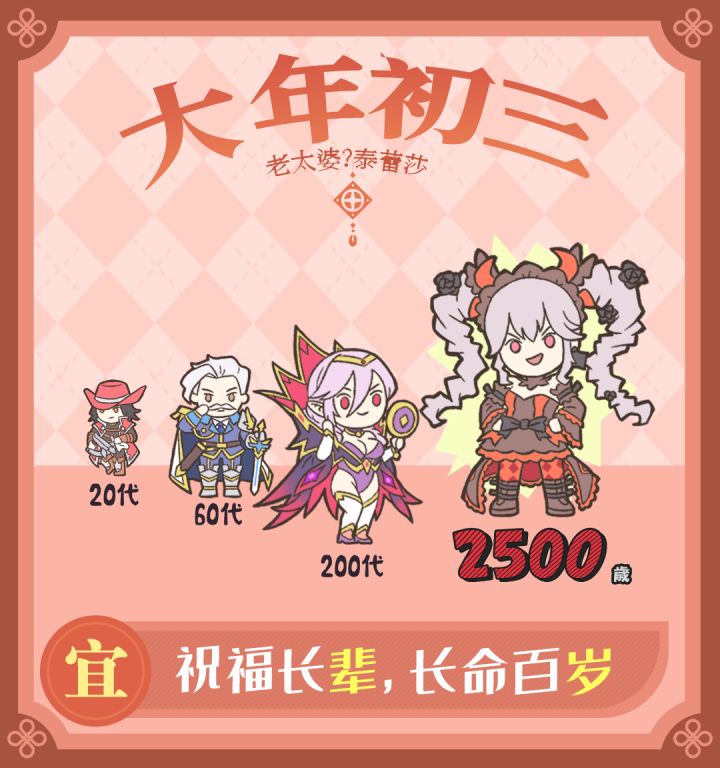 庶民们,你们面前的是尊贵的泰蕾莎听说今天叫什么大年初三,虽然不知道这天有什么意义,不过好像按照你们的说法需要给予祝福,那我就大发慈悲命令你们和我一起长久地活下去吧!