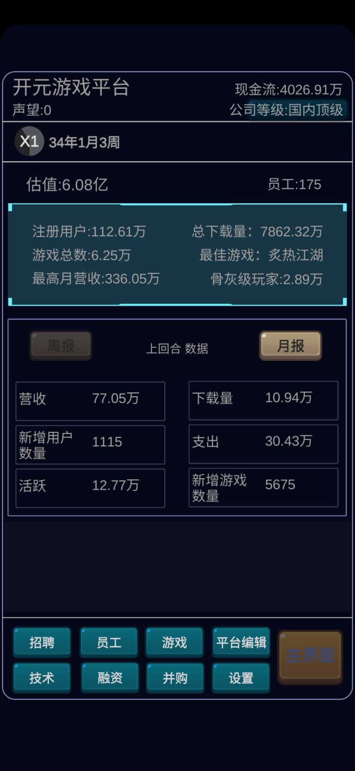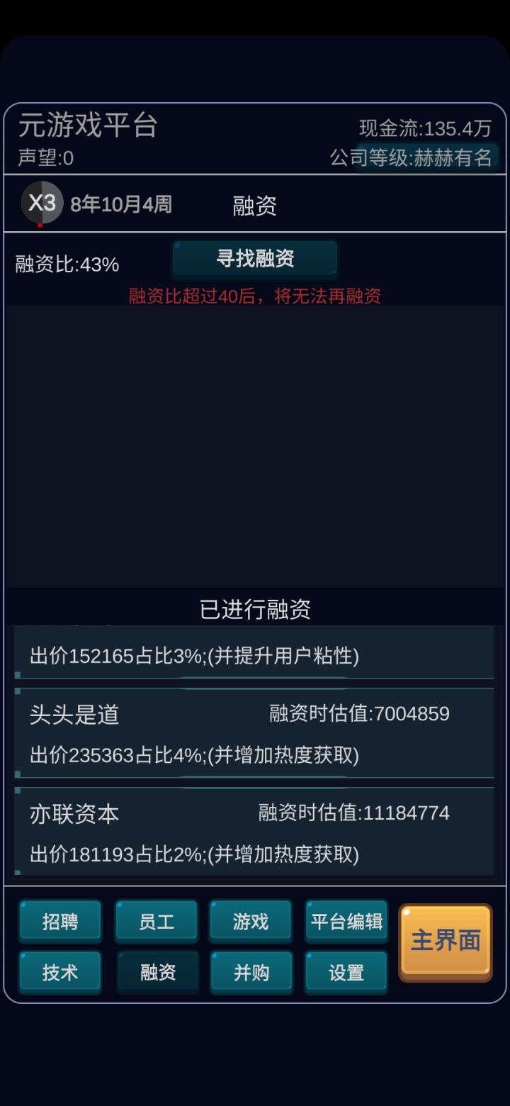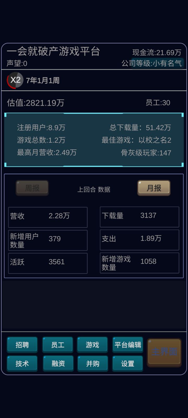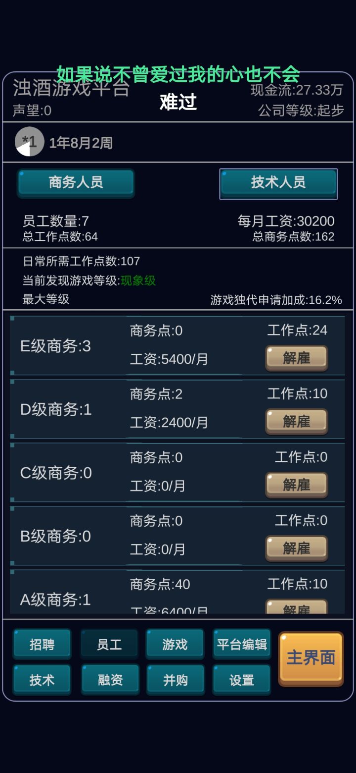 开局,商务用猎头招聘来二下,人全交了。E级的技术换了,招一轮D级的技术。然后再直接把开局的4个游戏买了,刚才招的商务人员直接清空。
