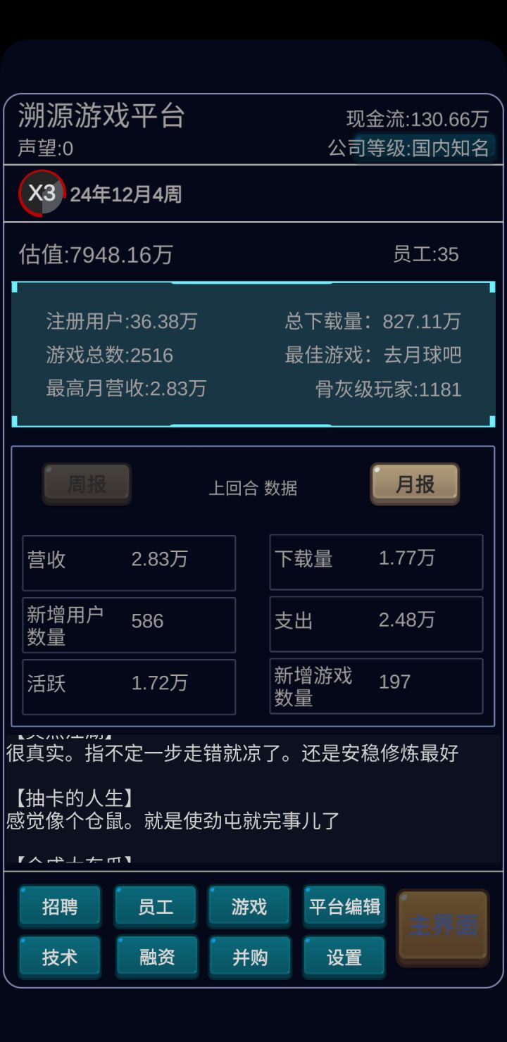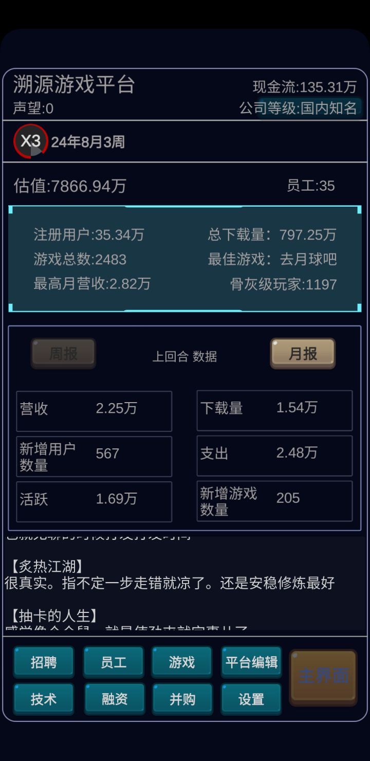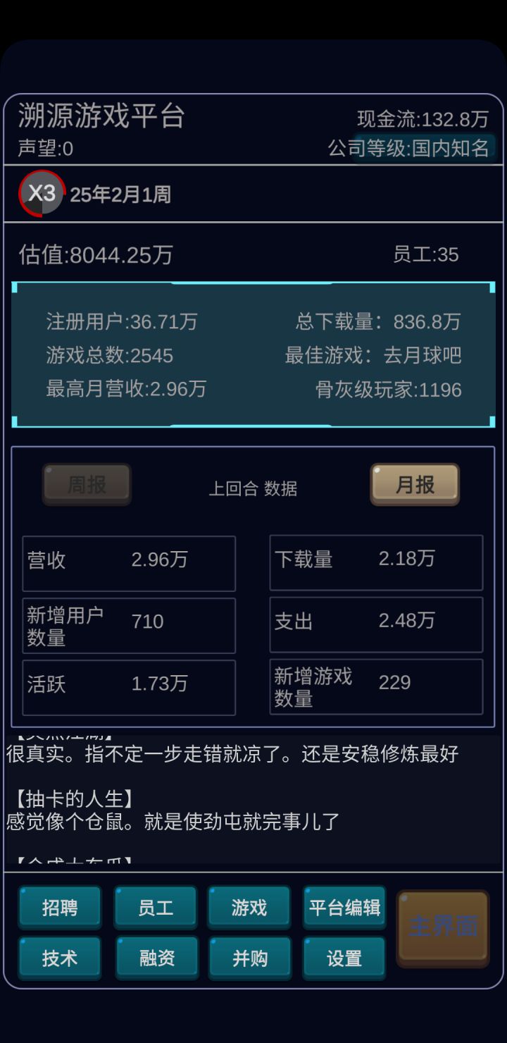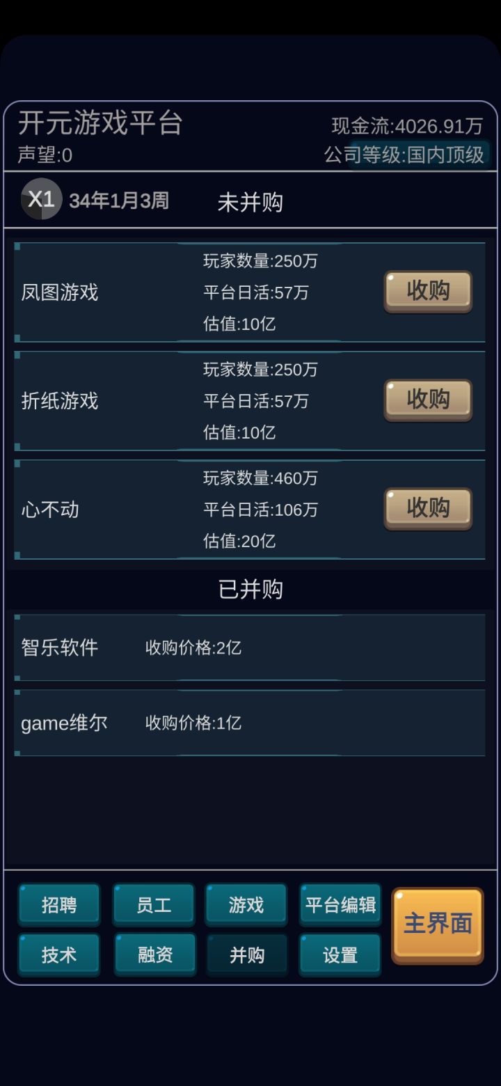 开局,商务用猎头招聘来二下,人全交了。E级的技术换了,招一轮D级的技术。然后再直接把开局的4个游戏买了,刚才招的商务人员直接清空。