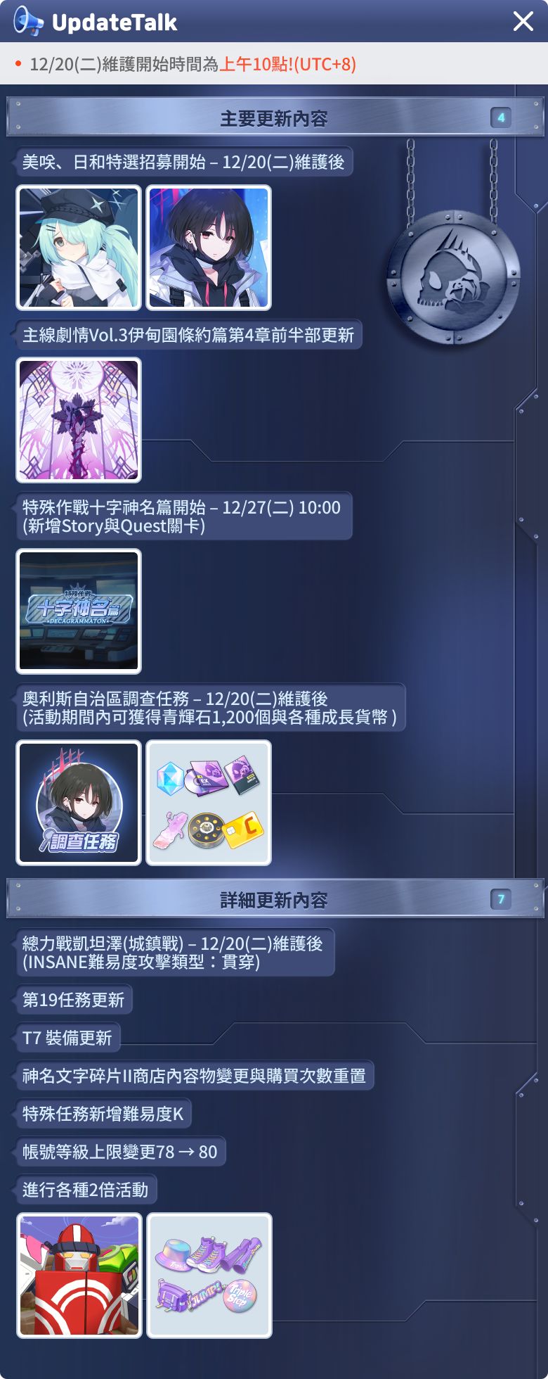 各位老師們好, 這裡要告訴大家12月20日的詳細更新內容。 [12月20日更新內容] 1. 時間:12月20日上午10點 ~ 4點 2. 影響:維護期間內無法登入遊戲 3. 補償:青輝石720個 ※ 12月20日維護後,請至應用程式商店更新至最新版本。 [12月20日更新主要日程] * 以下為開始/結束時間較為特別的遊戲內容主要日程表,詳細內容請確認各項目的更新詳細說明。(下方表格順序調整) [1