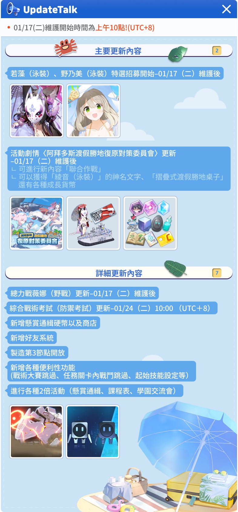 ㅤ 各位老師們好, 這裡要告訴大家1月17日(二)的詳細更新內容。 [1月17日(二) 更新內容] 1. 時間:1月17日(二)上午10點 ~ 下午4點 2. 影響:維護期間內無法登入遊戲 3. 補償:青輝石個 ※ 1月17日(二)更新後請至應用程式商店更新至最新版本。 [1月17日(二)更新主要日程] * 以下為開始/結束時間較為特別的遊戲內容主要日程表,詳細內容請確認各項目的更新詳細說明。