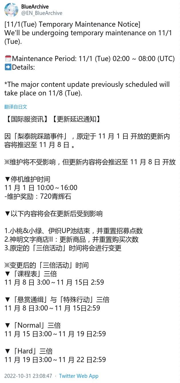 【国际服资讯】【明日更新推迟至8日】 各位老师好,这里是蔚蓝档案。 为了哀悼最近发生的令人遗憾的事故牺牲者,变更了原本预计在11月1日(二)进行的更新的日程,特此公告通知各位老师。 [11月1日(二)更新日程变更说明] - 更新日程 : 11月8日(二)上午10点 ~ 下午4点 * 11月1日(二)预计进行延期部分游戏内容日程的更新。 相关详细内容会再透过追加公告通知。 谢谢。 影响的日程请看下图