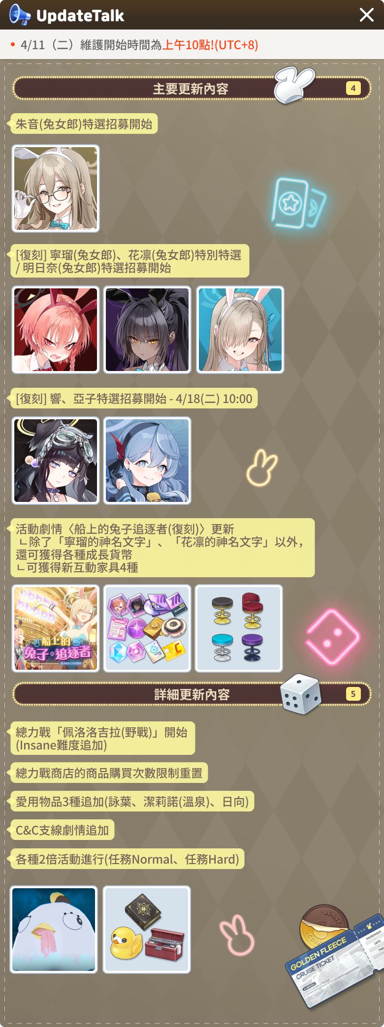 各位老師們好, 這裡要告訴大家4月11日(二)的詳細更新內容。 [4月11日(二)更新內容] 1.時間:4月11日(二)上午10點 ~ 下午3點 2.影響:維護期間內無法登入遊戲 3.補償:青輝石600個 [4月11日(二)更新主要日程] * 以下為更新後遊戲內容的主要日程表,詳細內容請確認各項目的更新詳細說明。 [4月11日(二)更新主要內容] [詳細更新內容] 1. 新增學生 1) 朱音(兔女