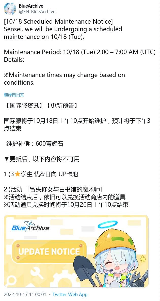 国际服将于10月18日上午10点开始维护,预计将于下午3点结束 -维护补偿:600青辉石 ▼更新后,以下内容将不可用 1.)3⭐学生 忧&日向 UP卡池 2.)活动 「冒失修女与古书馆的魔术师」 ※活动结束后,依旧可以兑换活动商店内的道具 ※活动道具兑换时间将于10月26日上午10点结束