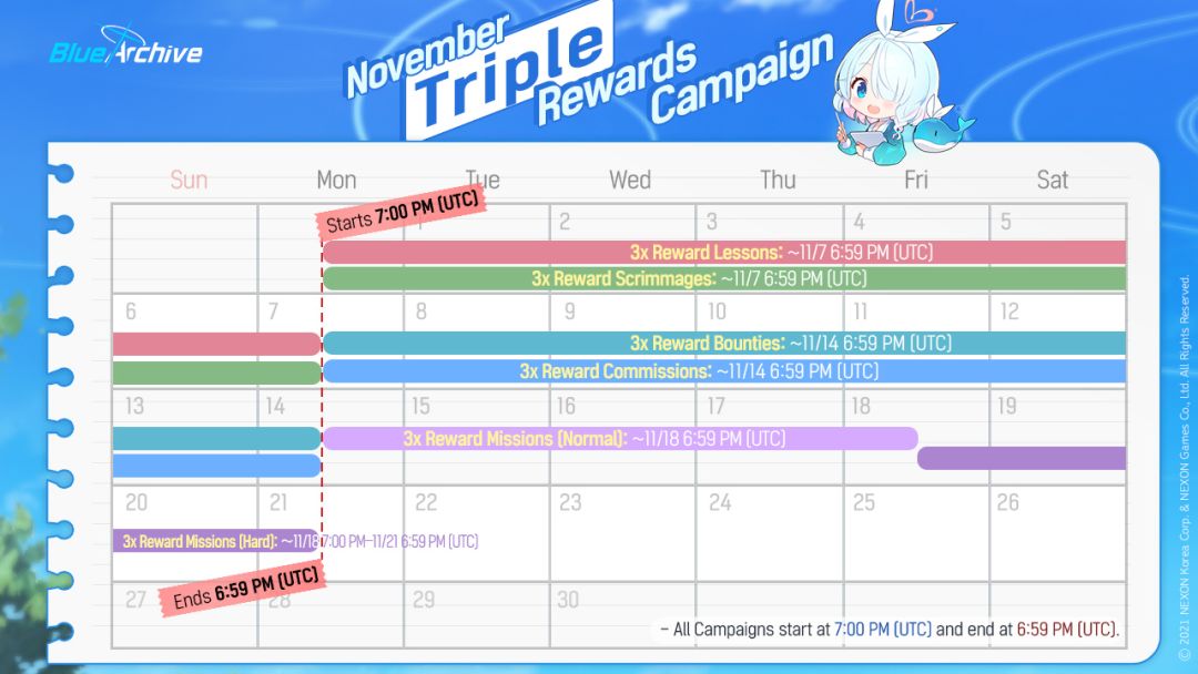 碧蓝档案 国际服 三倍活动预告 课程表&学院蕉流会三倍▼ 11月1日3:00~11月7日3:00 悬赏通缉&特别行动三倍▼ 11月7日3:00~11月14日3:00 普通本三倍▼ 11月14日3:00~11月18日3:00 困难本三倍▼ 11月18日3:00~11月21日3:00 #碧蓝档案##蔚蓝档案#