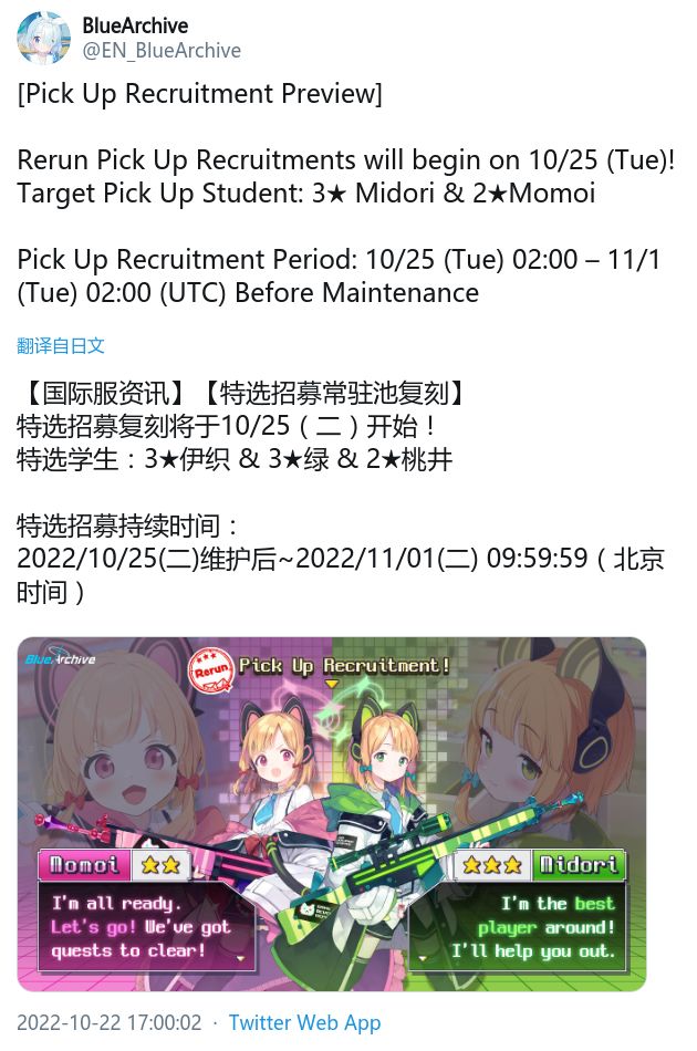 特选招募复刻将于10/25(二)开始! 特选学生:3★伊织 & 3★绿 & 2★桃井 特选招募持续时间: 2022/10/25(二)维护后~2022/11/01(二) 09:59:59(北京时间)#资讯爆料