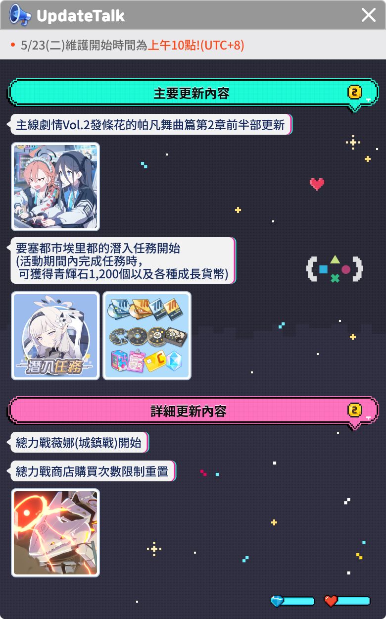 各位老師們好, 這裡要告訴大家5月23日(二)的詳細更新內容。 [5月23日(二)更新內容] 時間:5月23日(二)上午10點~下午3點 影響:維護期間內無法登入遊戲 補償:青輝石600個 [5月23日(二)更新主要日程] * 以下為更新後遊戲內容的主要日程表,詳細內容請確認各項目的更新詳細說明。 [5月23日(二)更新主要內容] [詳細更新內容] 1. 總力戰 – 薇娜(城鎮戰) - 活動期間 *