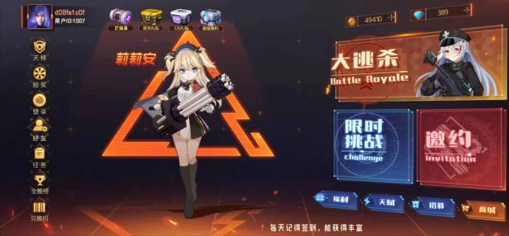 冒险家们,一女性角色为主题的射击游戏马上就要开始了,上次说了一些玩法和心得,把福利给忘了,今天就说一说福利吧。进入游戏后马上就会弹出一个签到,上面只要你点击签到就会有金币送你然后新手教程过后左边会有一排标识,有天梯,抽奖啊等等,个人感觉最主要的是抽奖,里面有钻石金币送你,如果你运气好的话还能抽到人物啊!对了抽奖上面还有一个是天梯榜,就是之前我说的每个游戏环节里面的积分就是在里面兑换奖励的里面
